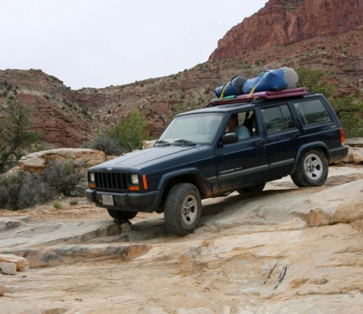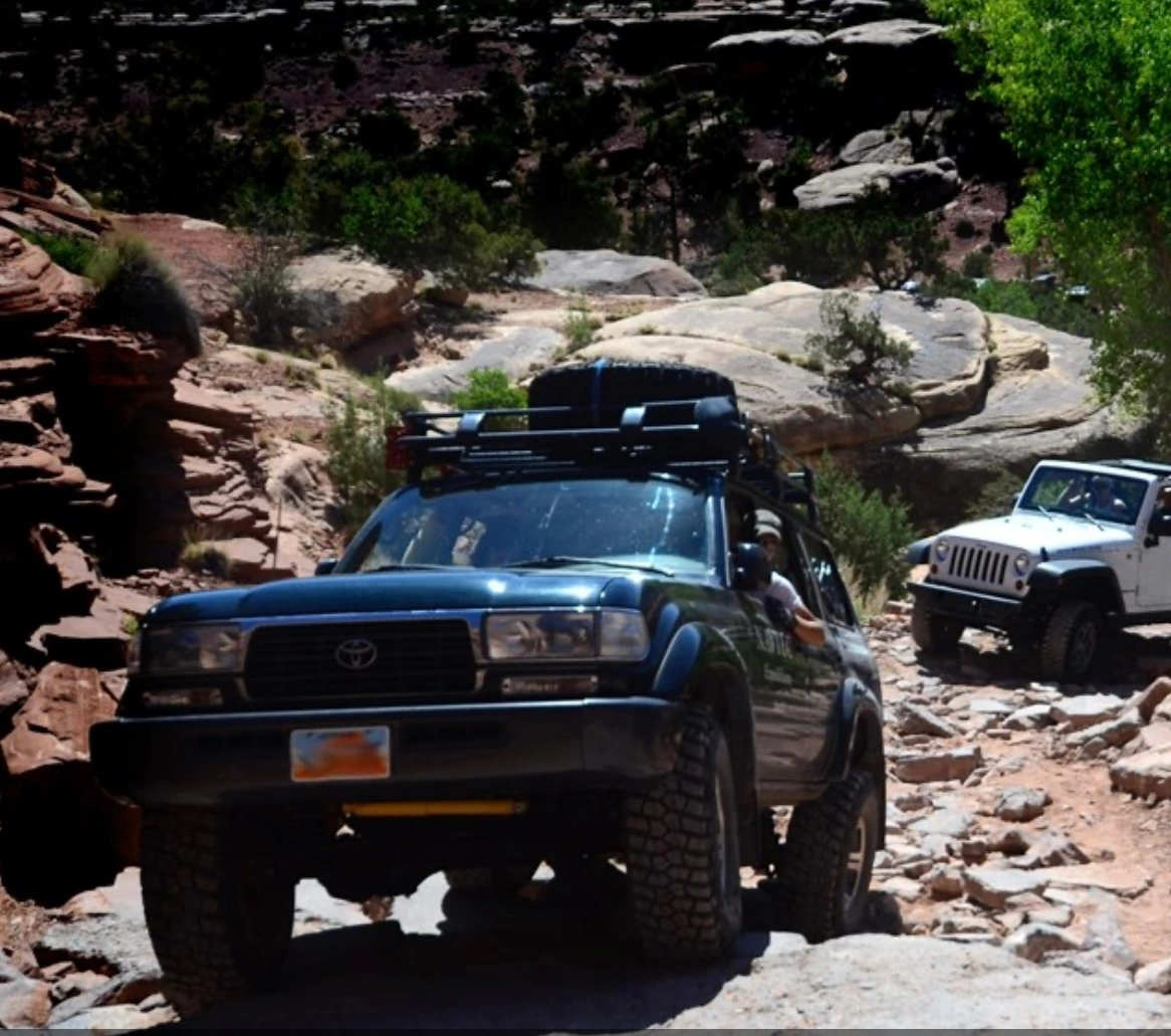 the Needles 구역의 울퉁불퉁한 비포장도로 위를 조심스레 지나고 있는 방문객들의 4륜구동 차행렬.