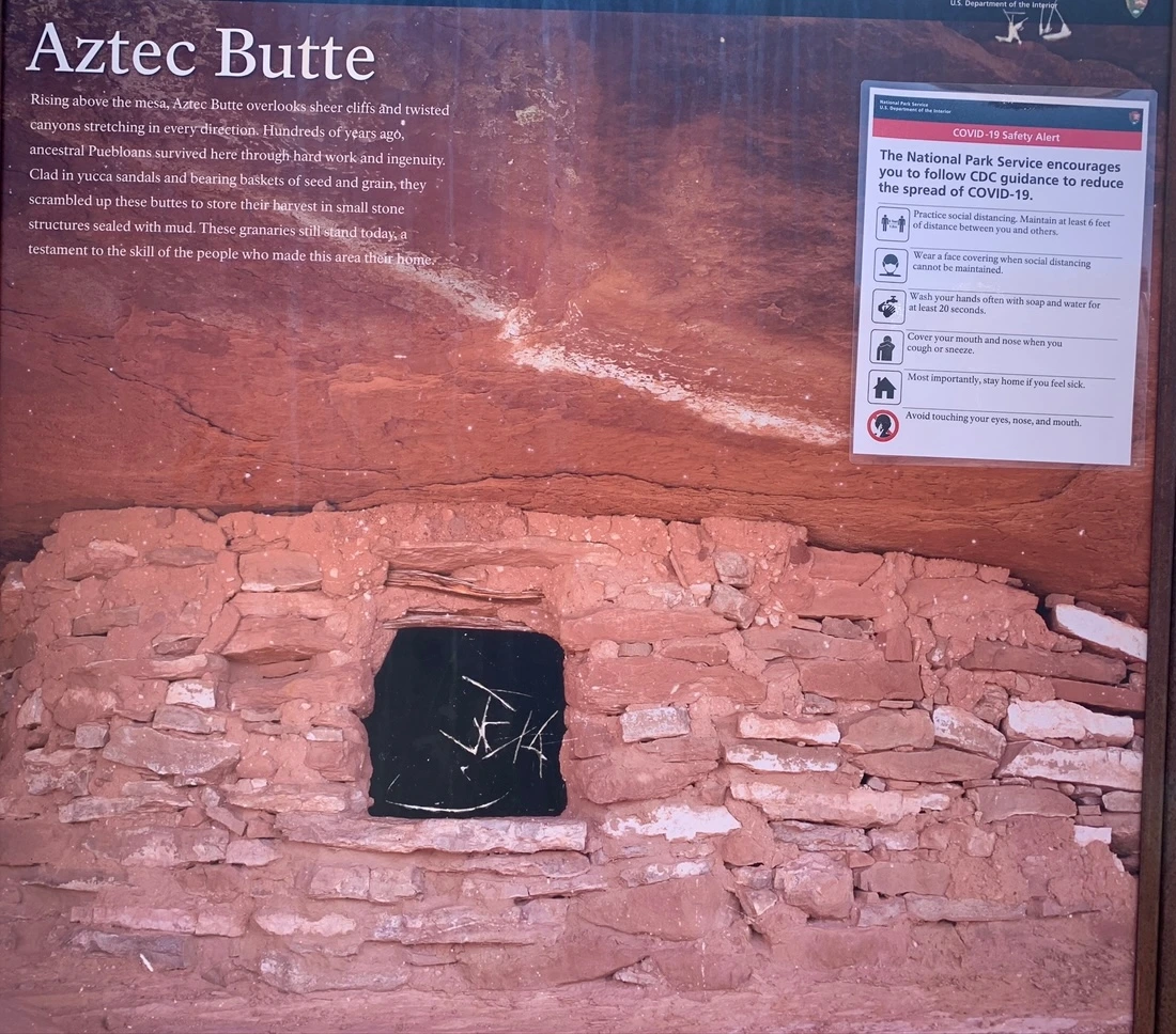 Aztec Butte는 해발 6,312피트 (1,924 meters)에 위치한 Navajo Sandstone으로 이루어진 여기에 거주했던 인디언의 거주지다. 위 지도에서 보면 Aztec Butte 트레일로 가는 중간쯤인 0.3마일 지점에서 왼쪽으로 0.2마일 더 가면 Granaries가 있다. Granaries란 곡식저장소 즉 창고를 의미하는데 그 밑에 lower Butte라고 표기되어 있다. Butte란 지형학(Geomorphology) 용어인데 절벽이나 가파른 언덕 같은 지형을 말하는데 mesa, plateaus, 그리고 tablelands와 같은 높은 고원지대보다는 약간 낮은 높은 지대를 말한다. Aztec Butte나 Granaries가 적들의 침입을 막기 위하여 그런 가파른 급경사가 있는 높은 곳에다 마련하는 것이다.
