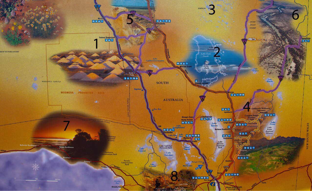 주요 관광지를 그림으로 표시한 것으로 PORT AUGUSTA 가기 전에 있던 REST AREA에 있었다. 글씨가 작아 잘 보이지는 않지만 대강 소개하면 이렇다. 아래 사진에 표시된 숫자대로 나열해보면 이렇다.