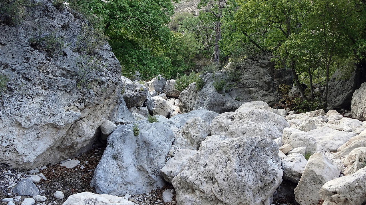 길이라곤 별도로 있는 게 아니고 계곡에 비가 오면 물 내려오는 길에 돌방구들이 널브러진 바닥을 따라 걷는 트레일이다. 지금은 바짝 말라 물은 없지만 울퉁불퉁한