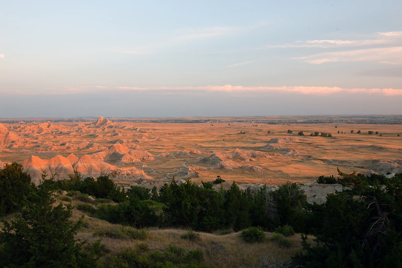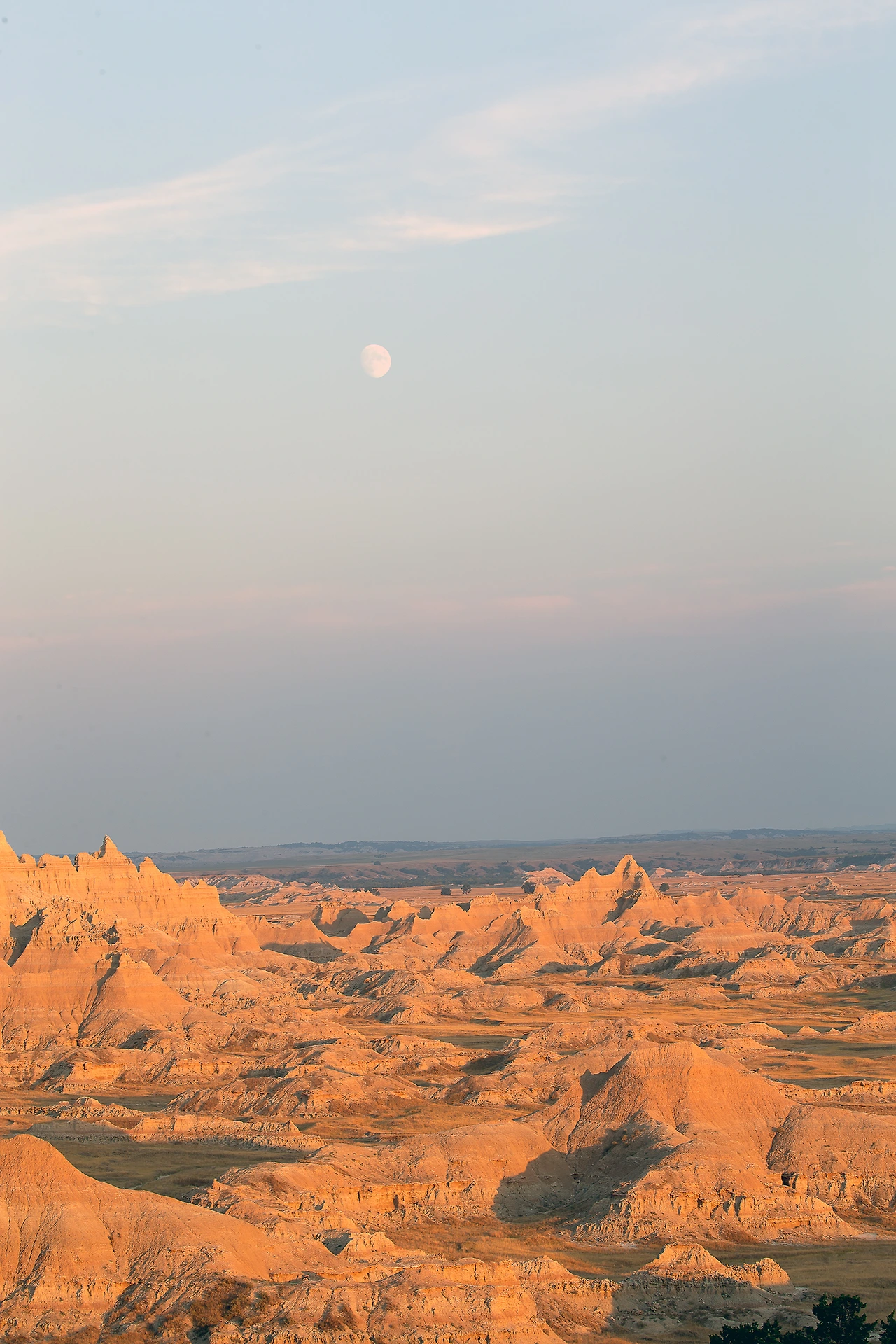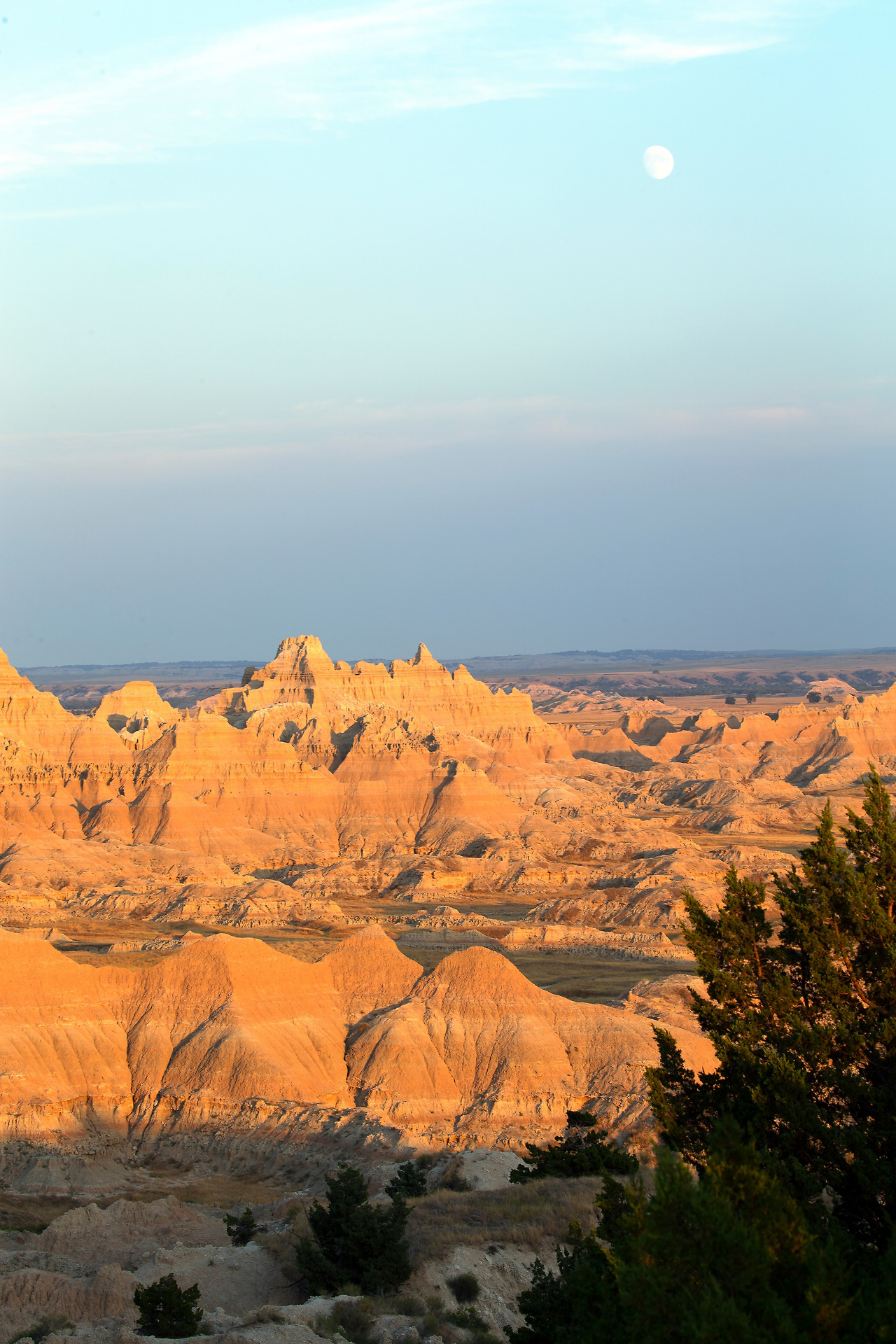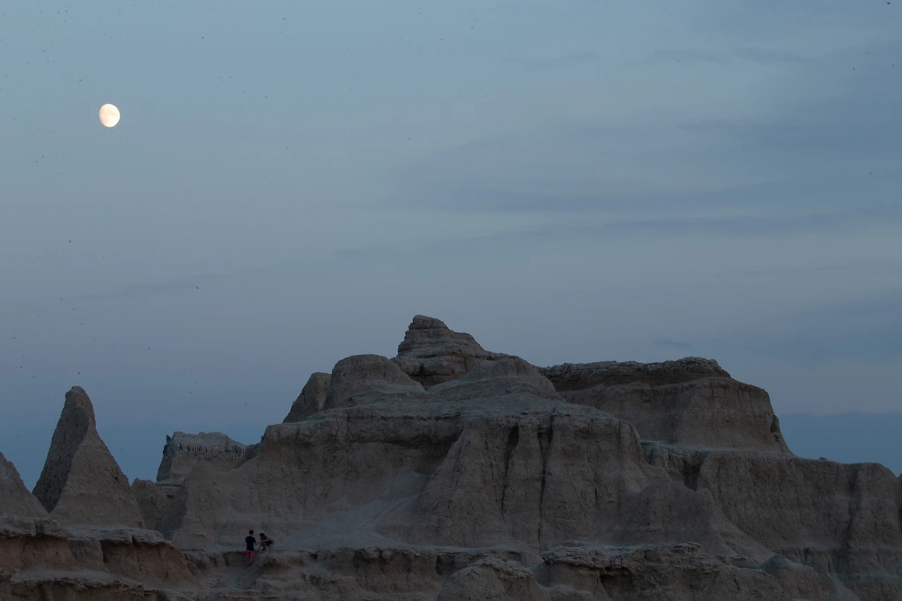 해가 서산으로 넘어가고 대신 둥근달이 공원 위로 솟았다. 낮시간에 보던 풍경과는 사뭇 다른 분위기를 자아낸다. 전체적인 방문 소감은 담에 충분한 시간을 가지고 다시 오고 싶은 공원이다. 일몰 또는 일출 사진을 Tripod로 촬영하면 진짜 대단한 작품을 생산할 수 있을 것 같다. 어차피 가까운 곳에 있는 Wind Cave NP를 못 보고 그냥 지나쳤으니 그곳을 다시 방문할 때 여기를 지나갈 테니 떠나기가 아쉽지만 그날을 약속하며 이번에는 여기까지 만족하기로 하였다.