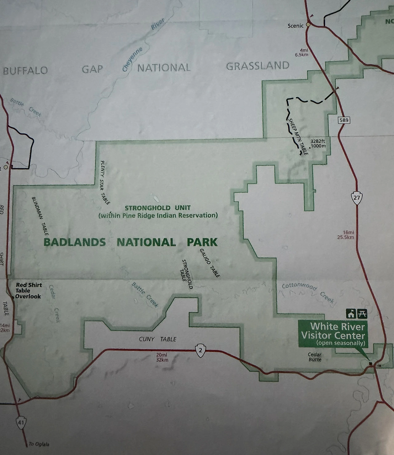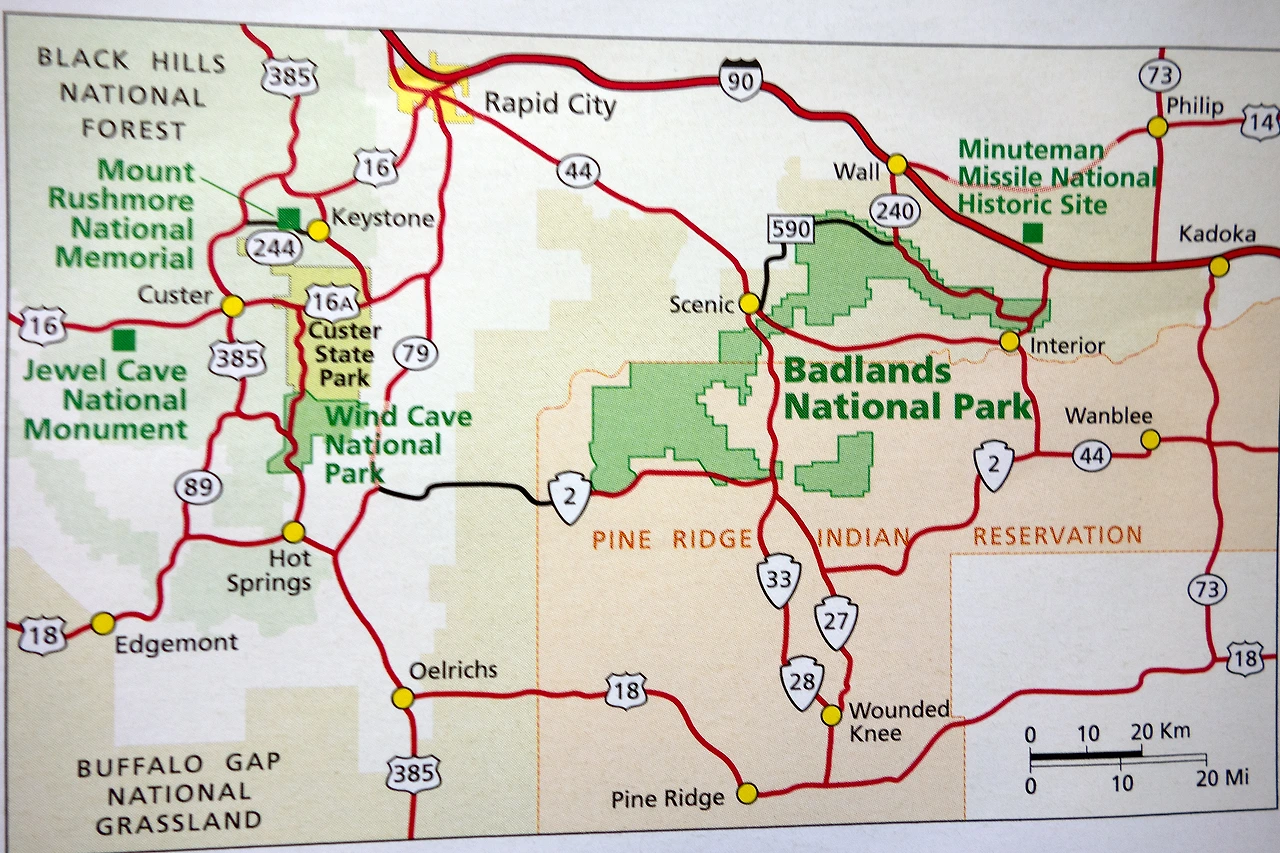 Mount Rushmore NM - Wind Cave NP - BadlandsNP로 이어지는 여정을 보여준다. Badlands NP가 엄청나게 큰 Ridge 인디언 거주지 안에 비교할 수도 없을 만큼 작은 면적으로 한 모퉁이에 붙어있는 꼴이다.