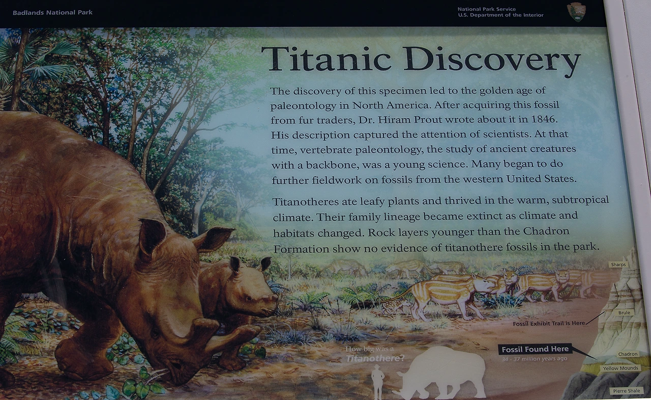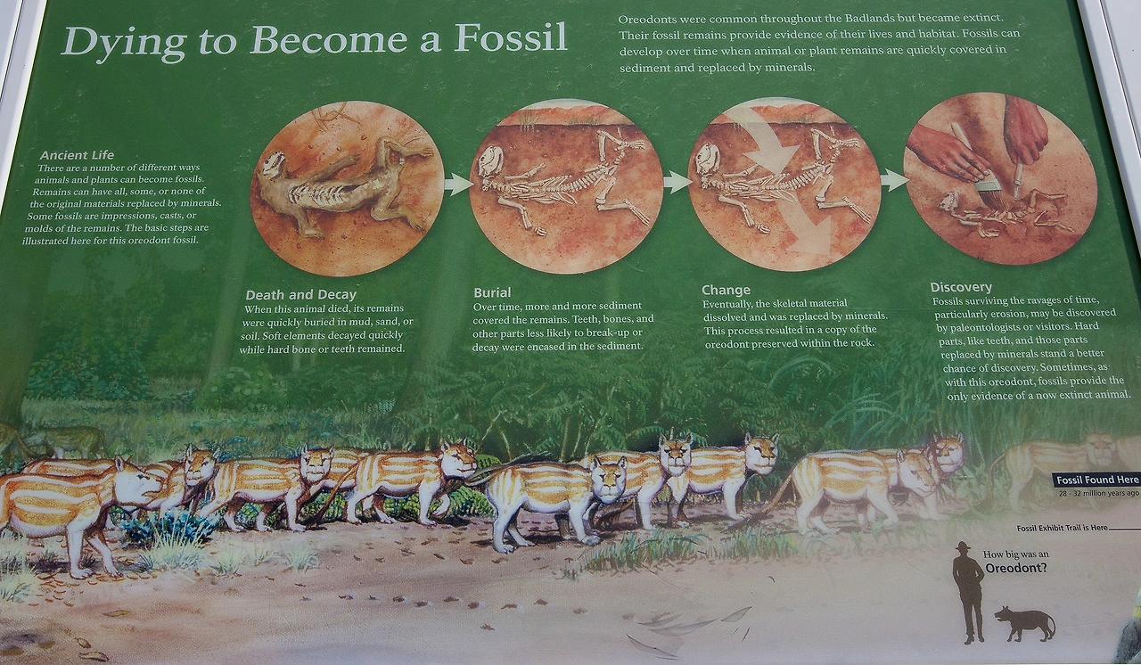 여기 서식했던 Oreodont(고대 포유류)의 화석(Fossil)이 어떻게 만들어지는지 그 과정을 보여주고 있다. 동물이 죽어 부식(Decay)이 되고 이나 뼈, 좀 더 부서지지 않는 부분은 새로운 침전물에 묻혀 오랜 시간에 걸쳐 그 형체가 다른 광물질에 스며들어 화석의 형태로 남아 있게 된다.