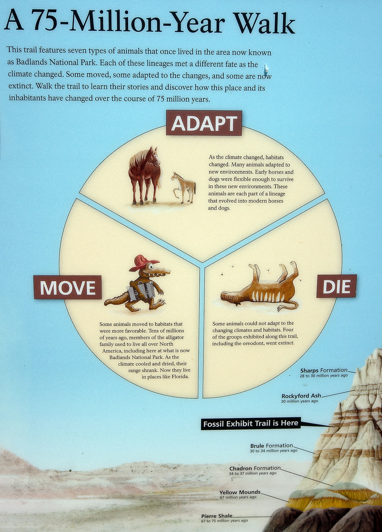 여기 Badlands NP에 살았던 동물들이 자연환경의 변화에 어떻게 대처했는지를 크게 세 가지 유형으로 보여 준다. 제일 흔한 방법은 동물 스스로 자연환경 변화에 적응(Adapt)하는 것이다. 두 번째는 변화된 환경에 적응 못하면 자기한테 맞는 환경으로 옮겨가는 것이다. 악어를 예로 드는데 예전에는 여기에 악어가 서식했는데 자연환경이 바뀌자 플로리다로 Move 했다는 것이다. 마지막 케이스는 환경에 적응도 못하고 절이 싫으면 중이 떠나야 하는데 그러지도 못해 결국 죽어서 도태(Extint)되는 경우이다.
