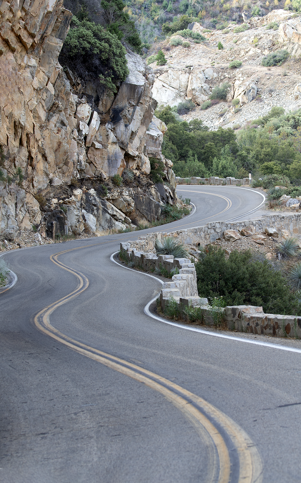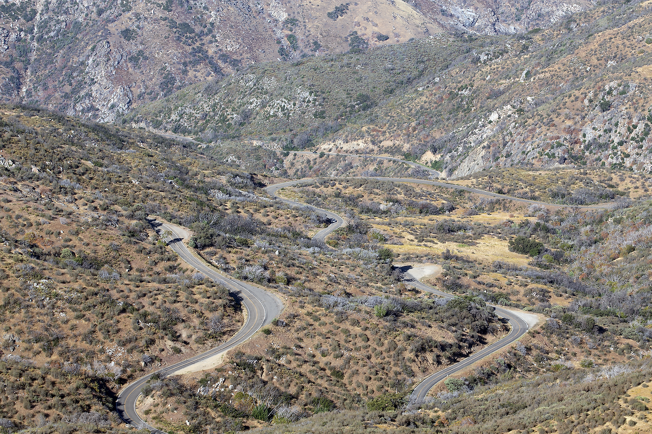 Cedar Grove로 가는 Scenic Drive 산중도로가 왼쪽에서 커브길을 내려와서 또 커브를 돌아 오른쪽으로 돌아 나가는 꼬불대는 도로다. 운전에 상당한 주의를 요한다.