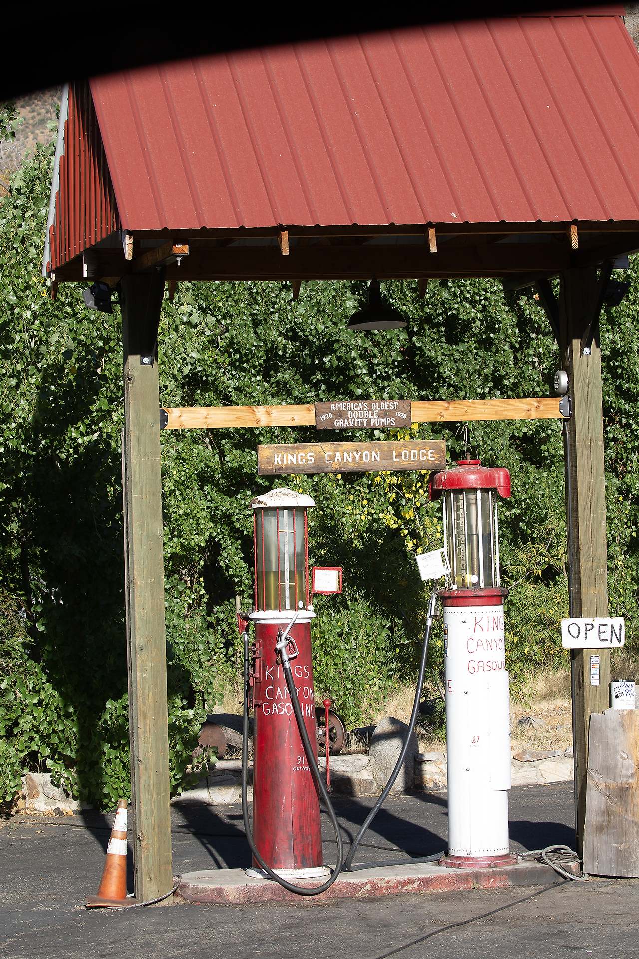 가서 보니 빨간 점이 주유소 지붕이었다. 가솔린펌프가 완전 앤틱 수준이었다. Kings Canyon Lodge 푯말을 보고