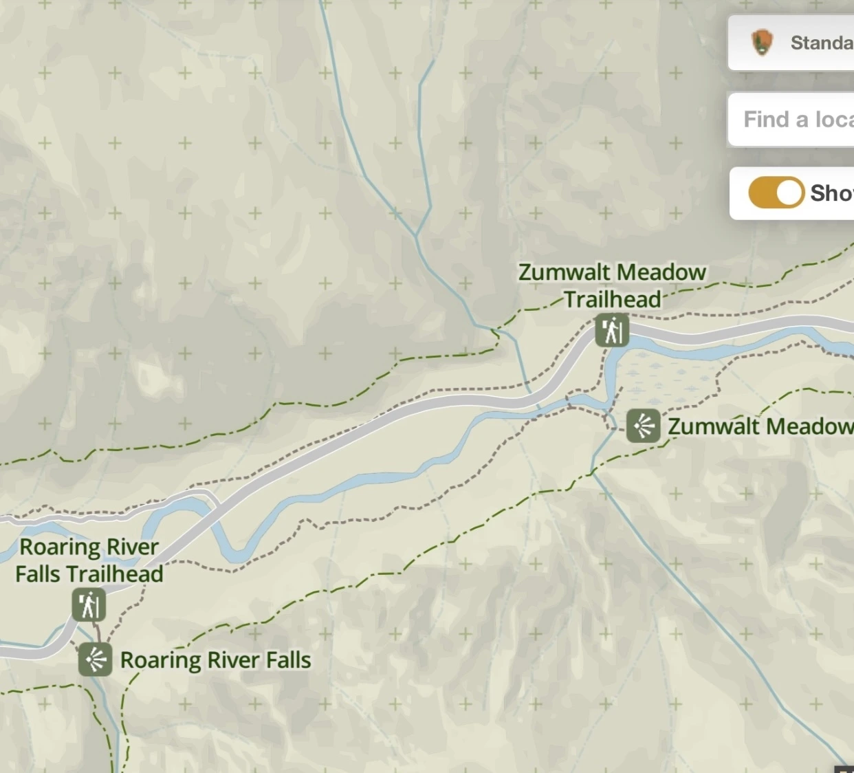 4월에서 11월 초사이에만 오픈되는 지역이다. Roaring River에서 흘러내리는 물이 낙차가 있는 곳에서 형성된 폭포다. 수영을 금지하지는 않은 모양인데 바닥이 미끄럽고