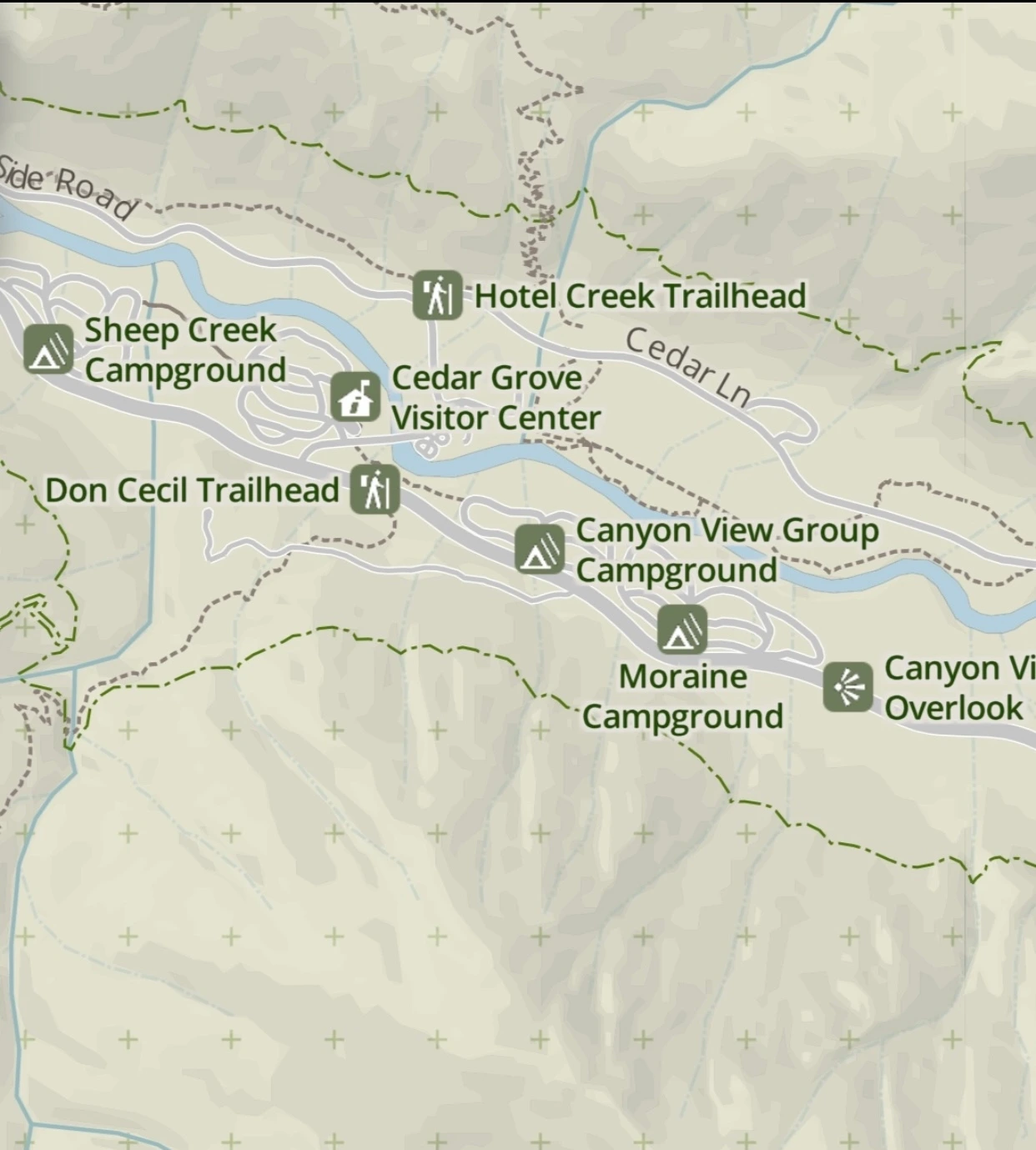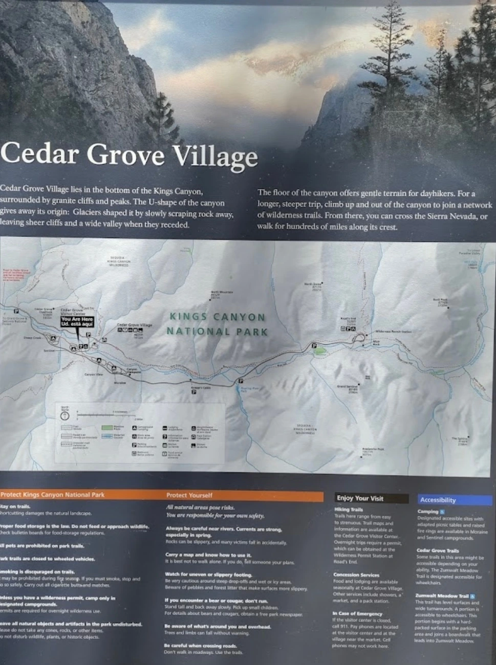 소소한 볼거리가 있는데 나는 Visitor Center와 캠핑장이 있는 Cedar Grove에서 하룻밤 자기로 작정하고 50km를 계곡을 따라 운전했다.