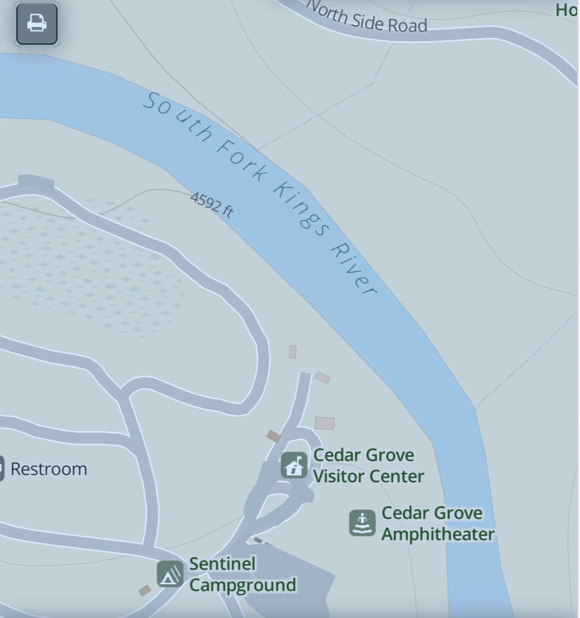 South Fork of the Kings River 옆에 있는 Cedar Grove Visitor Center. 일단 거리가 멀어 첩첩산중에 있다 보니 조용하고 아늑한 분위기는 최고였다. 혹 킹즈 캐년 국공을 방문할 계획이 있는 사람은 Cedar Grove에서 2-3일 캠핑을 고려해 보는 것을 강추한다.
