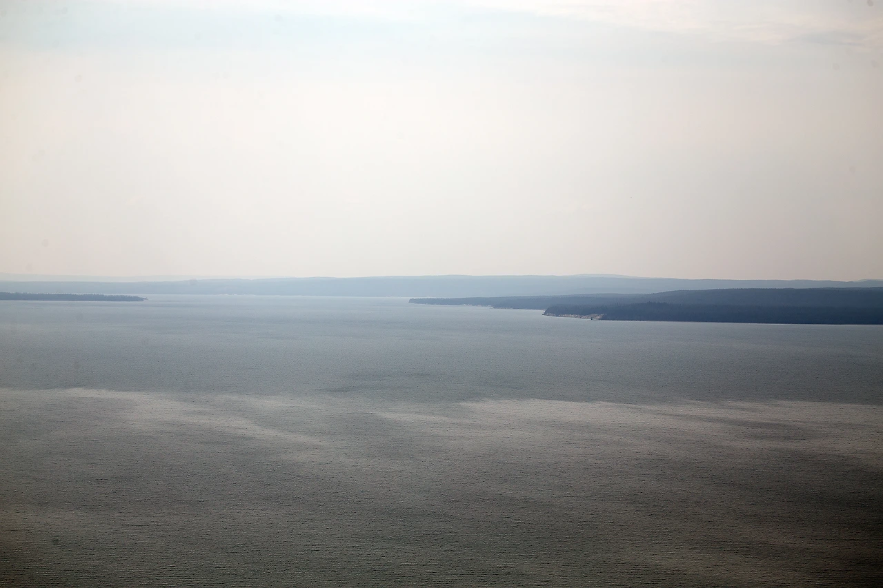 오른쪽으로 시선을 돌리면 내가 지나온 길들이 희미하게보인다. 활대처럼 휘어진 호수호안(해안?) 끝에 툭 튀어나온 곳이 아까 내가 지나 온 Steamboat Point로 이쪽 연안 쪽이 Sedge Bay이고 저쪽이 Mary Bay이다.