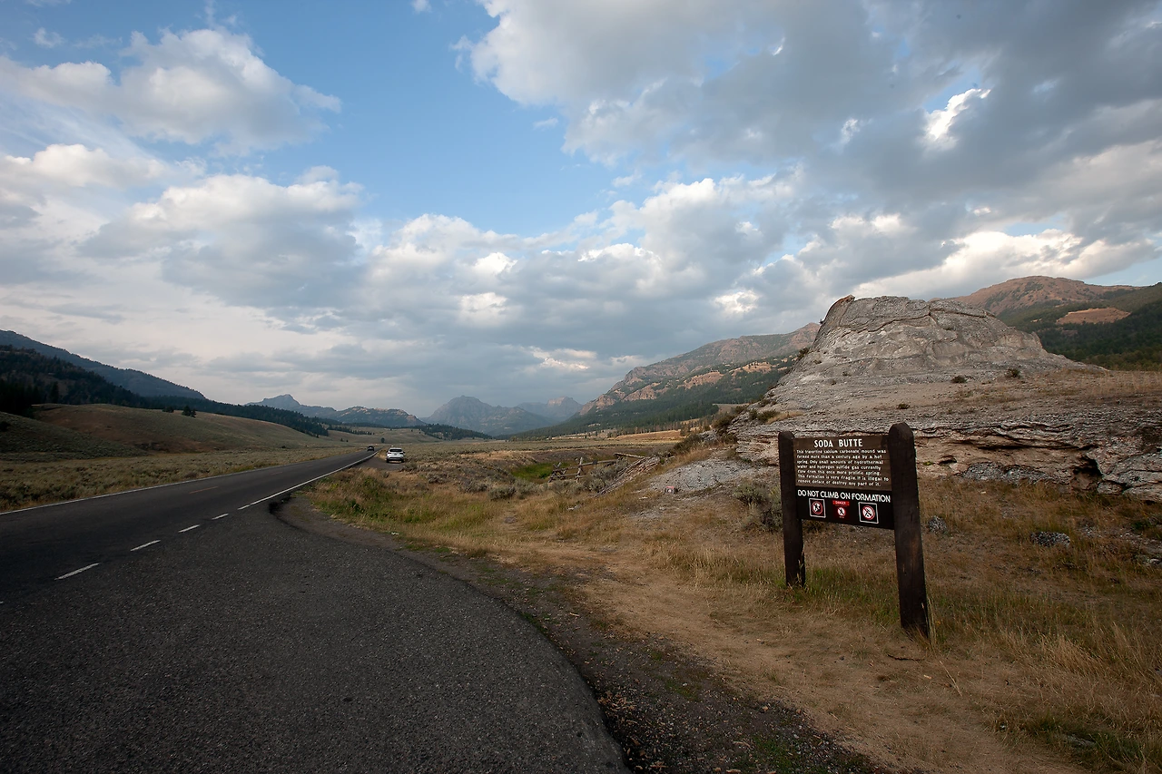 길을 계속 달리다가 무슨 입간판이 서 있었다. 거의 출구에 가까운 위치에 있었다. 잠깐 내려서 입간판을 읽어보니 Soda Butte이라고 하는 travertine mound로 Mammoth Hot Springs에서 많이 본 석회화 단구의 Cone type으로 약 천년 전에 형성된 것이라고 한다.