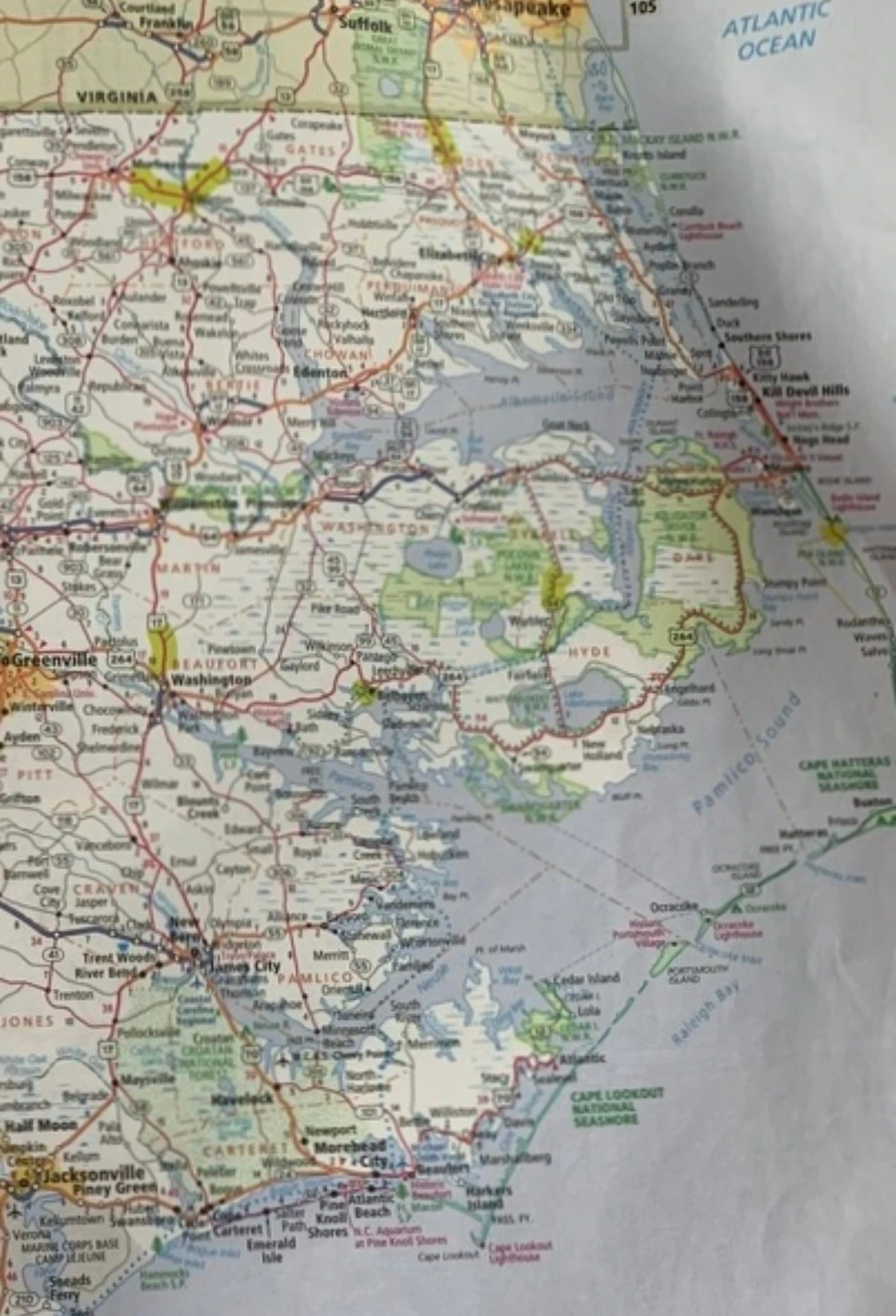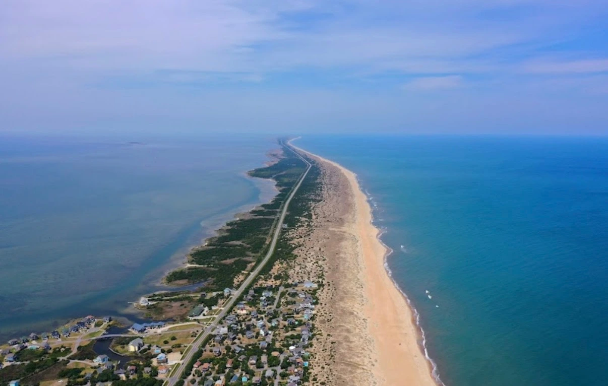 Cape Hatteras National Seashore 지도다. 미국에서첨으로 조성된 National Seashore로 70마일 이어진 모래톱에 도로만 뻗어있다. 때 묻지 않은 해변과 불어오는 바닷바람으로 쌓여진 모래언덕, 풍부한 야생생물(특히 각종 조류와 거북이), 이 지역의 역사, 낚시와 캠핑 등을 즐길 수 있는 곳이다. 1박 2일의 완벽한 드라이브 코스로 섬에서 오롯하게 하룻밤을 보내는 낭만도 즐길 수 있는 곳이다.