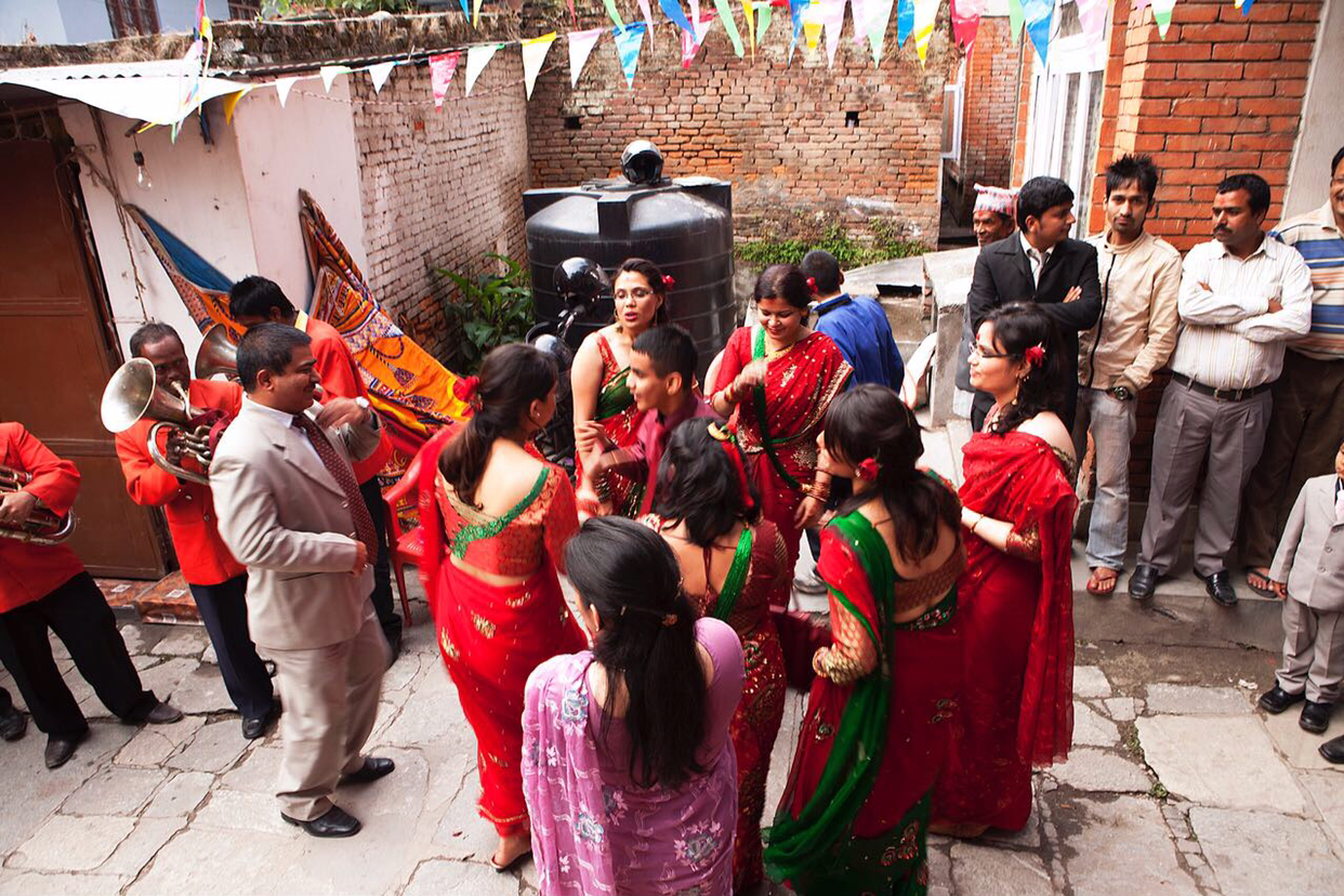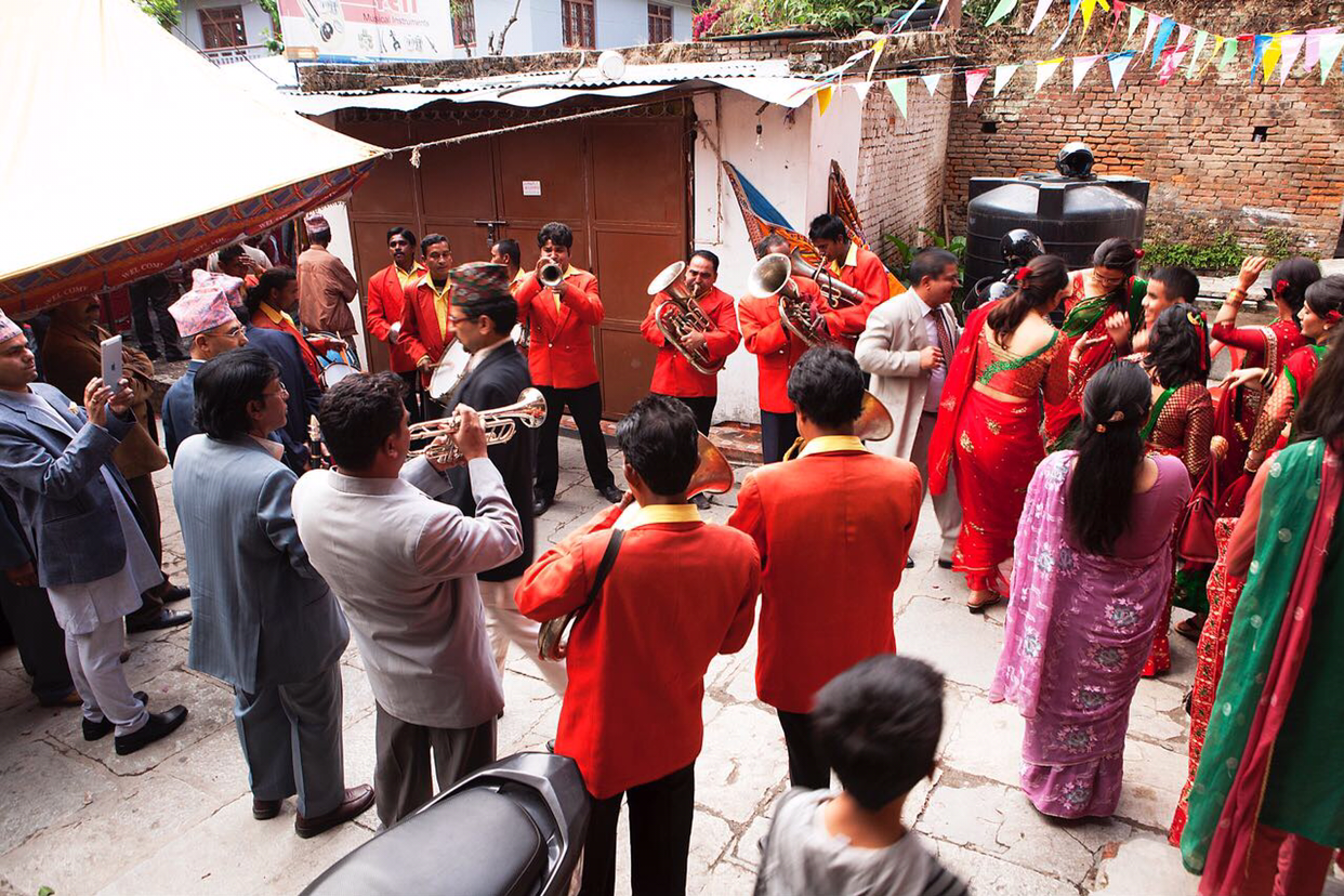 점심을 먹고나서 타맬거리를 구경하는데 난데없이 풍악소리가 귀를 찌른다. 네팔 전통 결혼식을 하는 모양이다. 단복을 차려 입은 연주단들이 신나게 연주를 하면 그 뒤를 이어 신부 친구들이 한바탕 춤을 추고 논다. 웬일인지 신랑 친구들은 안 보이고 신부 친구들만 난리다.