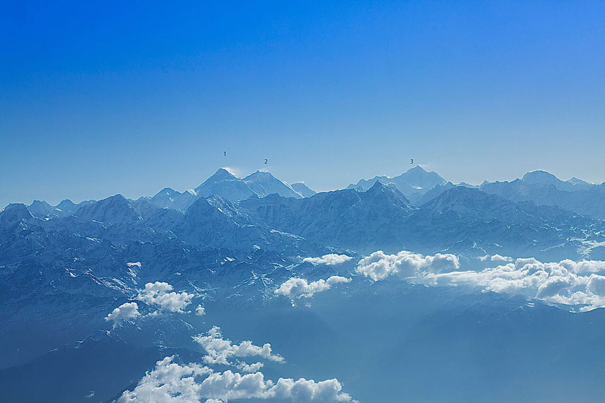 이륙한지 10분정도 날다 보면 왼쪽으로 서서히 히말라야 산맥들이 하얀 만년설을 머리에 이고 드디어 그 모습을 드러낸다. 이 때부터 여승무원이 나누어 준 팜플렛에 있는 봉우리 이름을 하나씩 거명하며 지금 보시고있는 것이 무슨 봉우리인지 설명해 주는데 우리가 보면 전부 봉우리가
