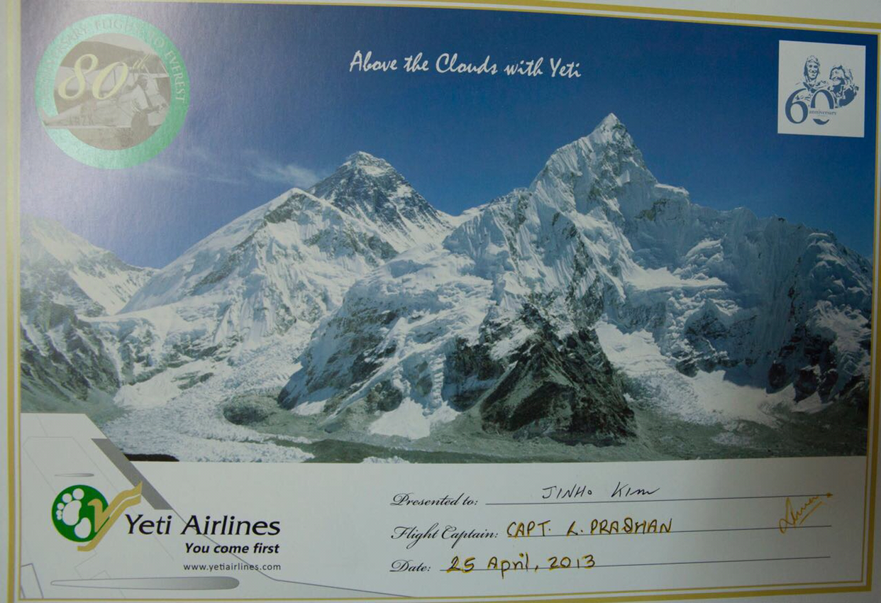뱅기회사가 발급한 에베레스트 등정 확인서. -JH-