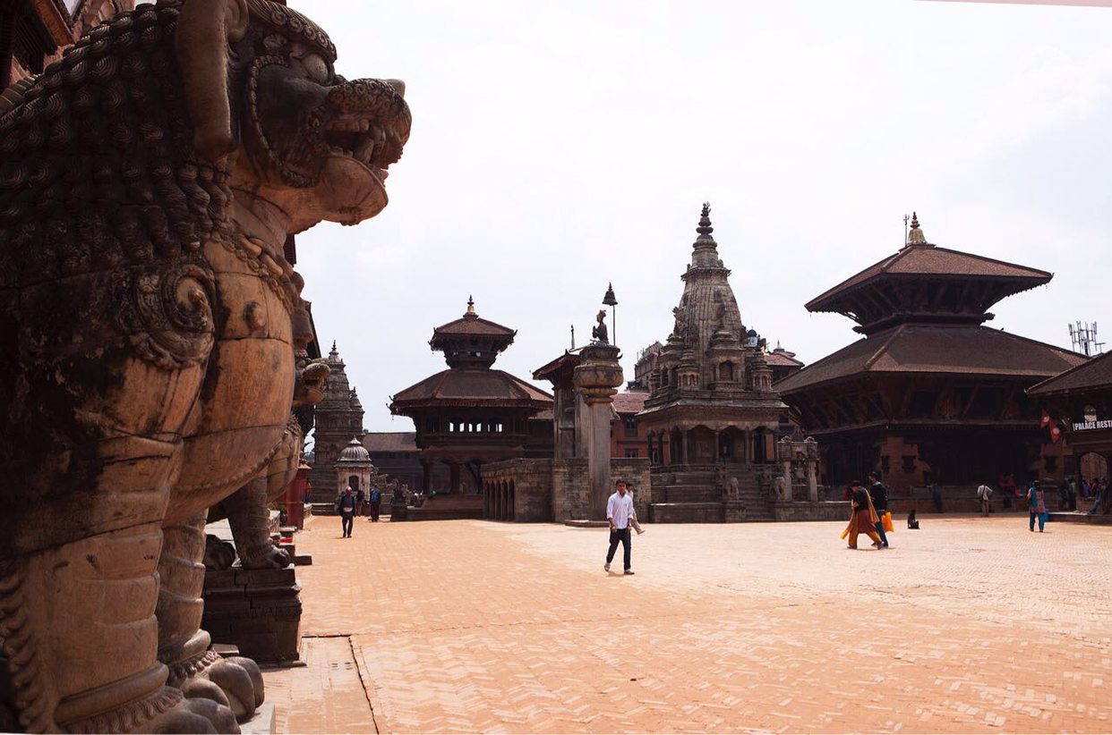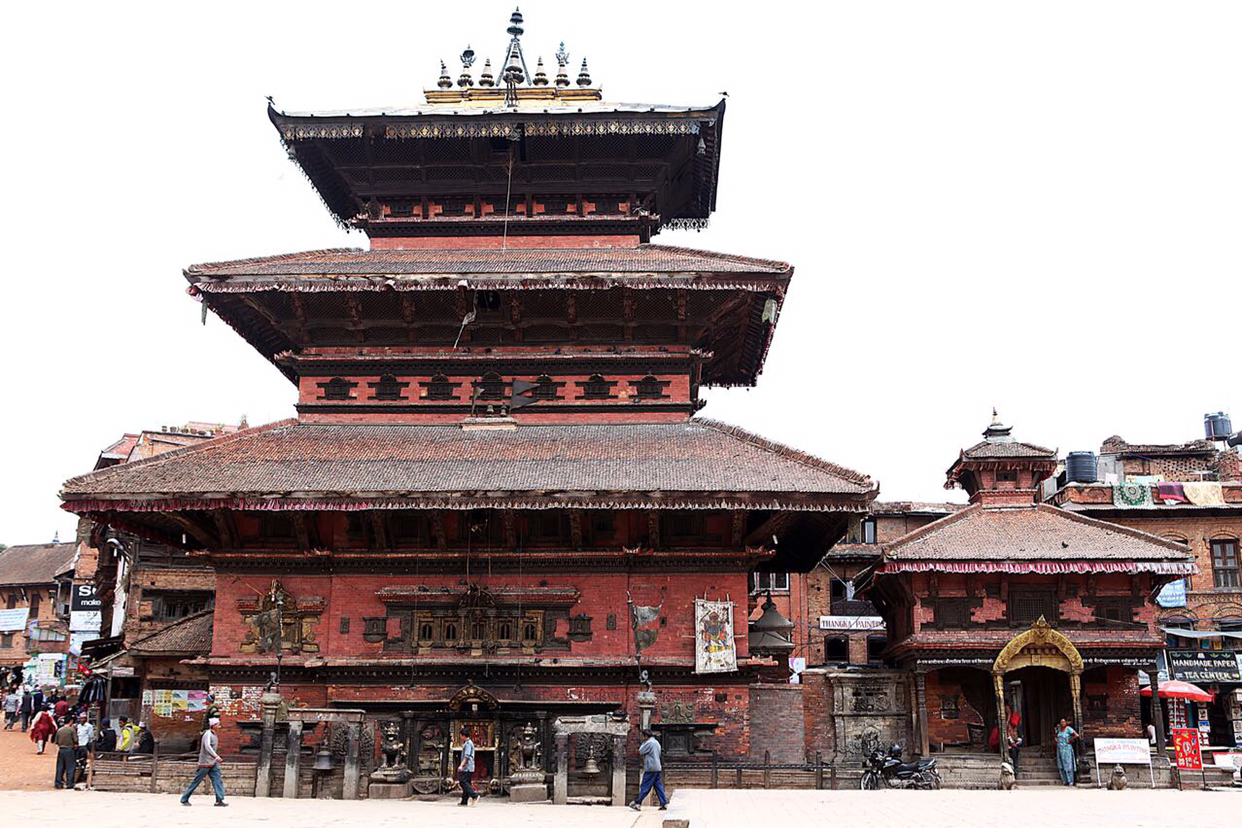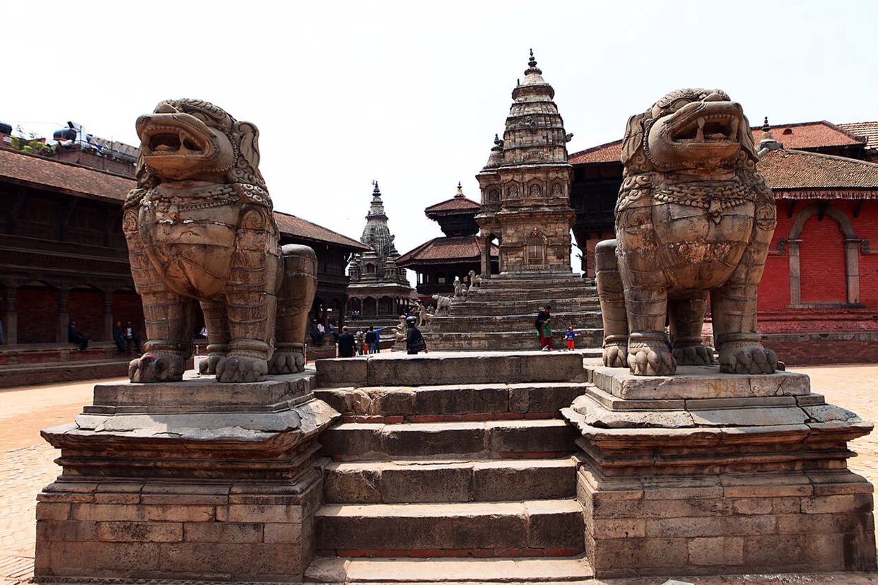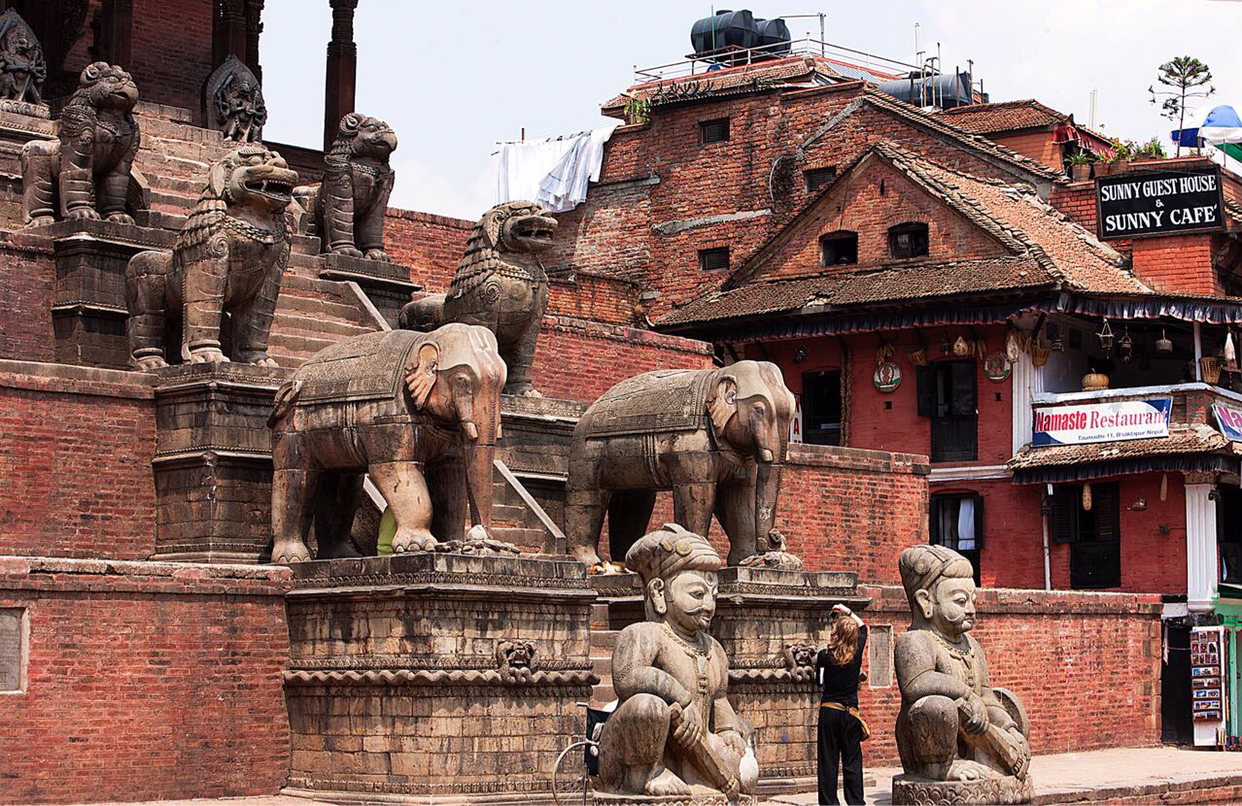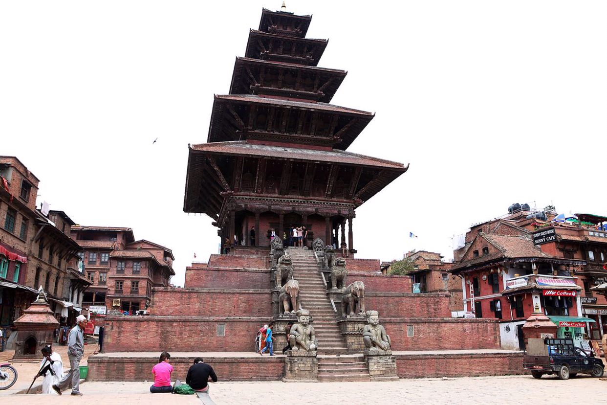 냐타폴라(Naytapola) 사원. 30미터 높이의 5층 목탑으로구조가 튼튼하게 지어져 1934년 대지진이 왔을 때도 끄떡없었다고 한다. 층마다 좌우로 조각상이 자리잡고 있는데 맨밑에는 사람, 코끼리, 사자, 그리핀 순으로 올라가는데