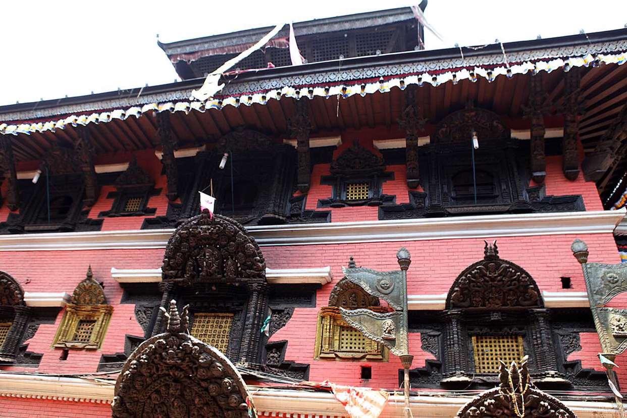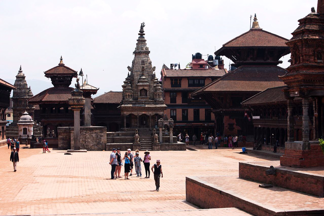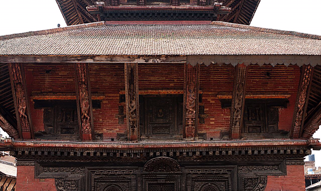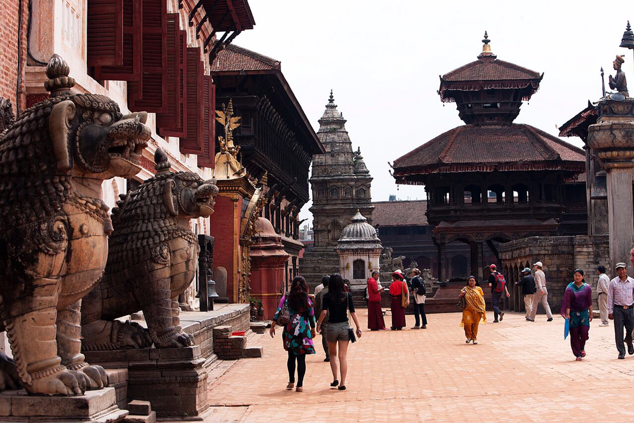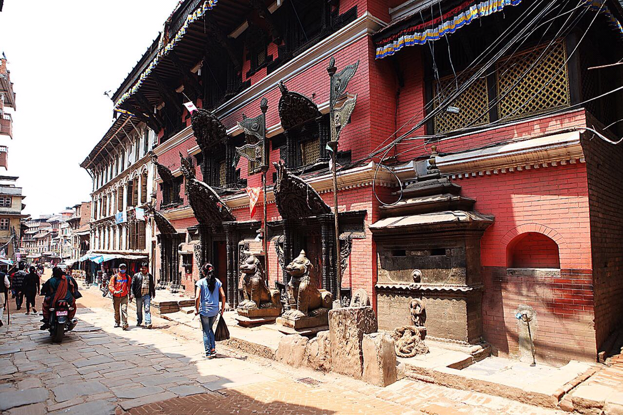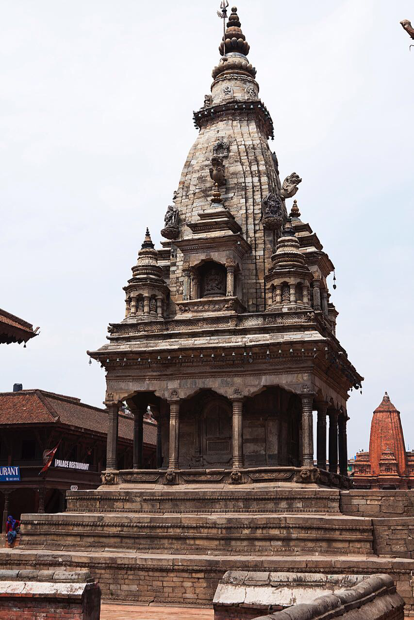 냐타폴라(Naytapola) 사원. 30미터 높이의 5층 목탑으로구조가 튼튼하게 지어져 1934년 대지진이 왔을 때도 끄떡없었다고 한다. 층마다 좌우로 조각상이 자리잡고 있는데 맨밑에는 사람, 코끼리, 사자, 그리핀 순으로 올라가는데