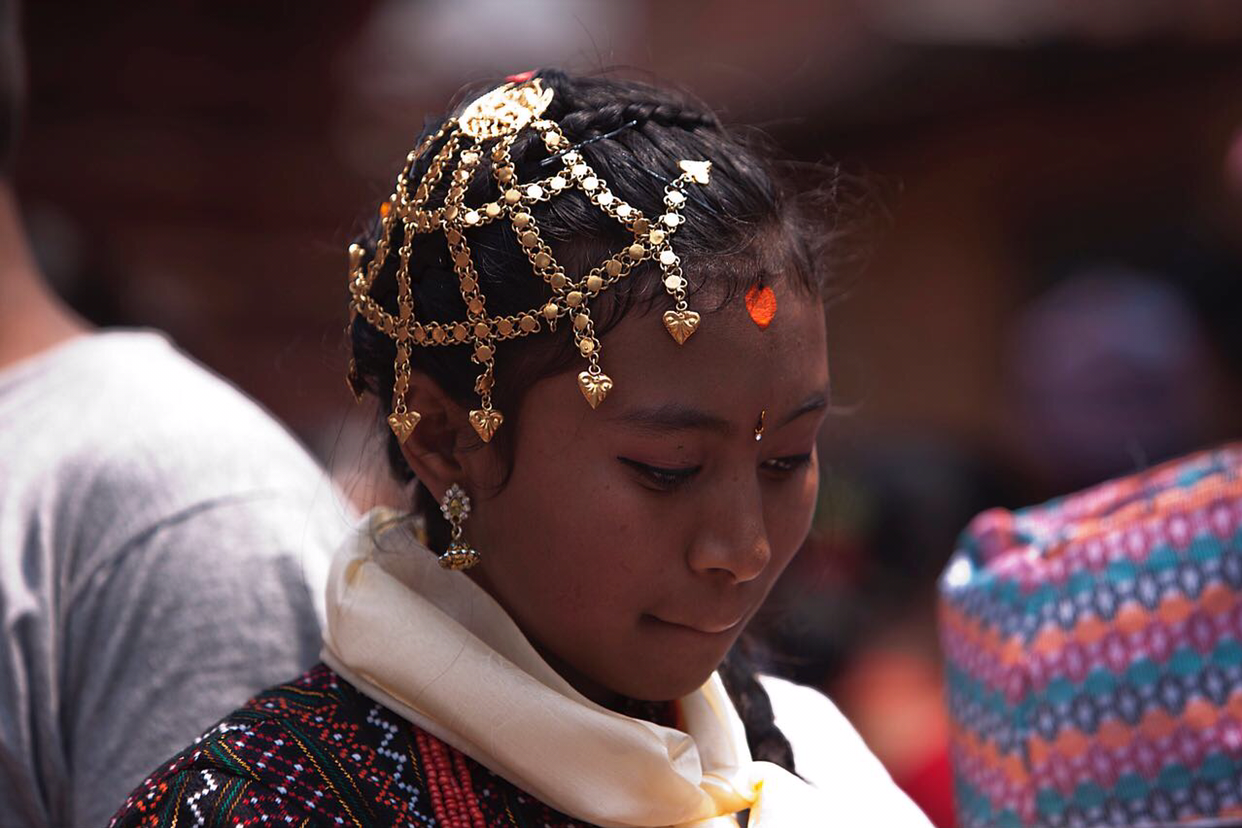 머리에 특이하게 치장을 한 소녀. 성인식인가?