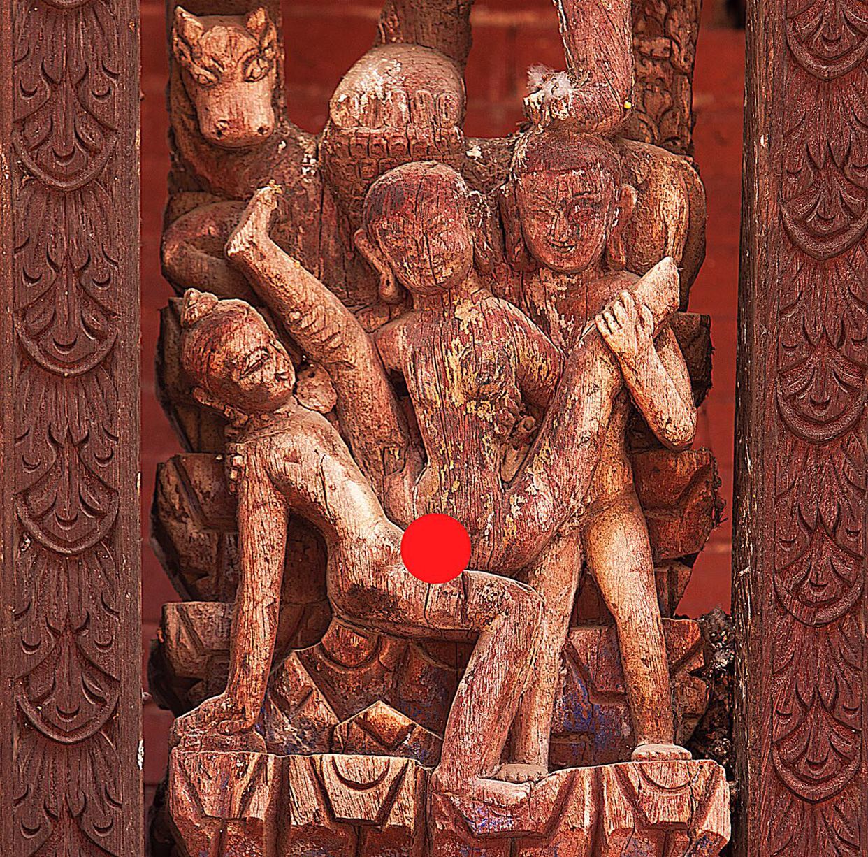 광장으로 들어 서면 중간에 회교식 탑이 있고 그 오른쪽에 흰두 사원이 있다. 그 사원 지붕받치는 추녀목에서 탄트라 교본을 다시 찾았다. 동서남북 네변을 받치는데 한 변에 6개 추녀목 밑에 하나씩 나무로 조각되어 있어 총 24개 동작이 있어 고개 아파도 교육자료로 활용할 가치가 충분히 있을 것 같아 24판 다 찍었다. 그 중 하나만 공개한다.