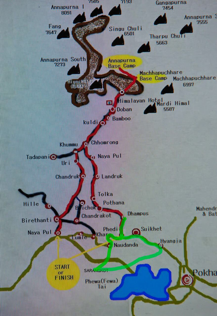 이렇게 트레킹인지 네팔 농촌 취재를 나온건지 분간 안되게 걷다가 반환점인 나우단다까지 세시간 훨씬 더 걸려 도착하게 되었다. 여기서 발길을 돌려 게스트하우스로 그냥 돌아갔더라면 안나푸르나 ABC 속으로 들어 가볼 수도 없었는데 공연한 객기로 트레킹타입도 아닌 내가 ABC에 발을 들여 놓아 직살나게 고생하였지만 대신에 ABC 진입경로 확실하게 알게 되었고 트레킹 좋아하는 절친을 위해 현지 가이드까지 물색해 놓고 가격까지 네고된 상태이니 나의 절친 너그들은 뱅기표만 끊어 가지고 날아 가면 된다. 그걸 다음 편에서 밝혀주꾸마. -JH-