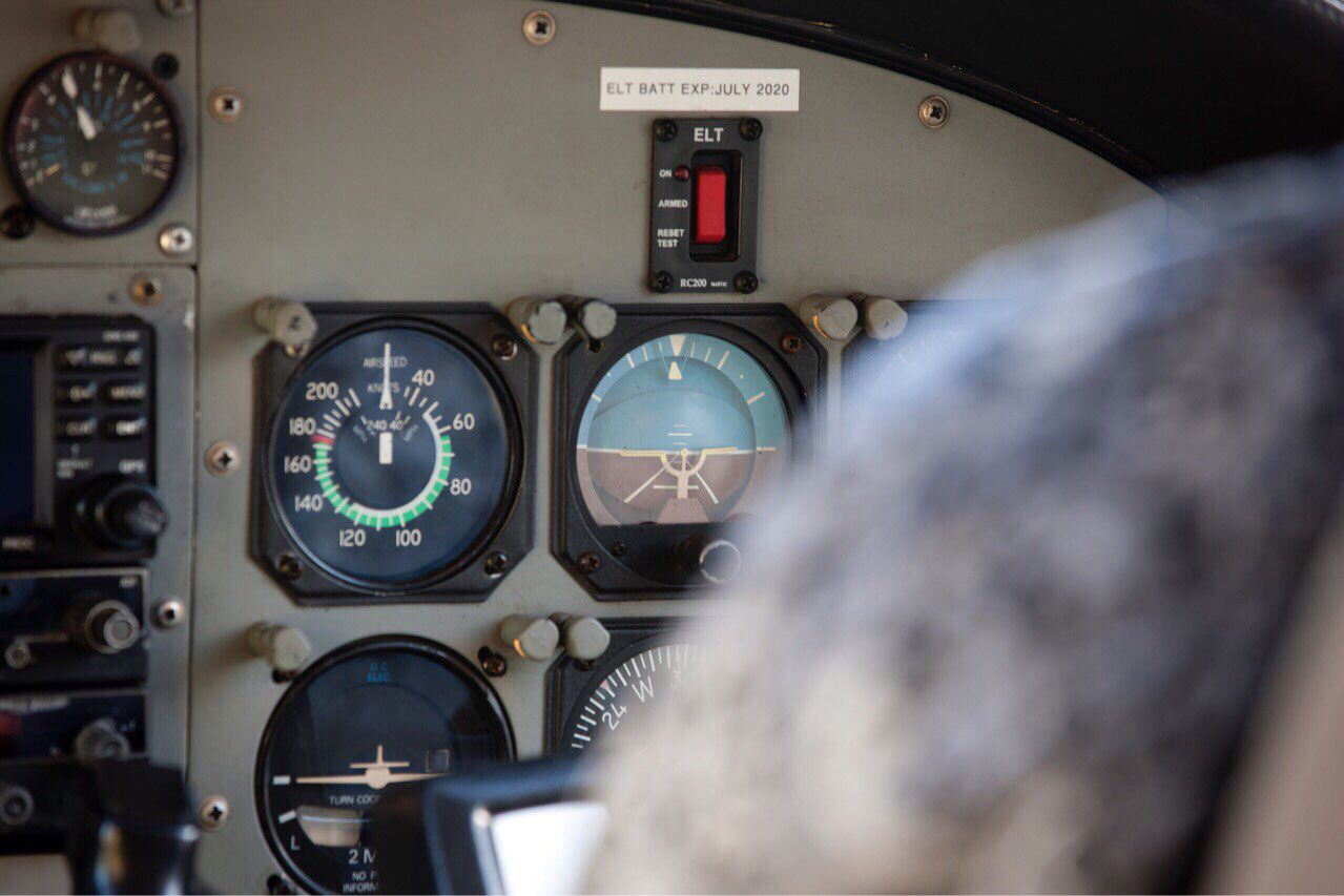 경비행기 각종 계기판. 저건 비행기 수평을 보여주는 수평계와 고도계. 경비행기를 조종해 본 사람들의 경험담을 들어보면 구름 한점없는 맑은 하늘에 같은 색의 바다색이 어우러지면 하늘에 떠 있어도 어디가 하늘이고 어디가 바다인지 구분하기가 힘들다고 한다.