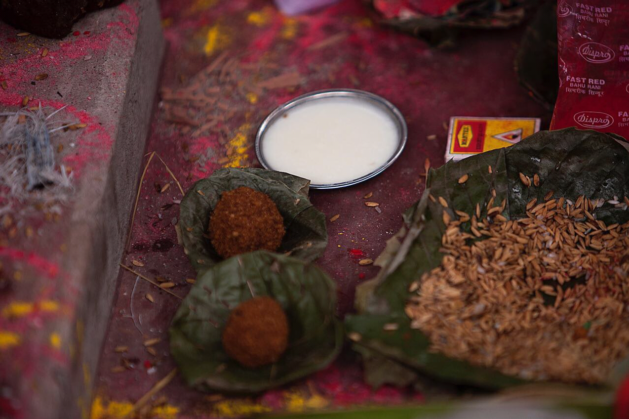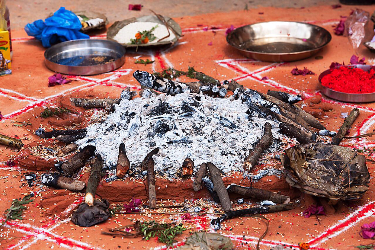 모닥불 주위로 곡식이랑 띠까랑 여러가지 의식에 필요한 재료들이 널브러져 있었다.
