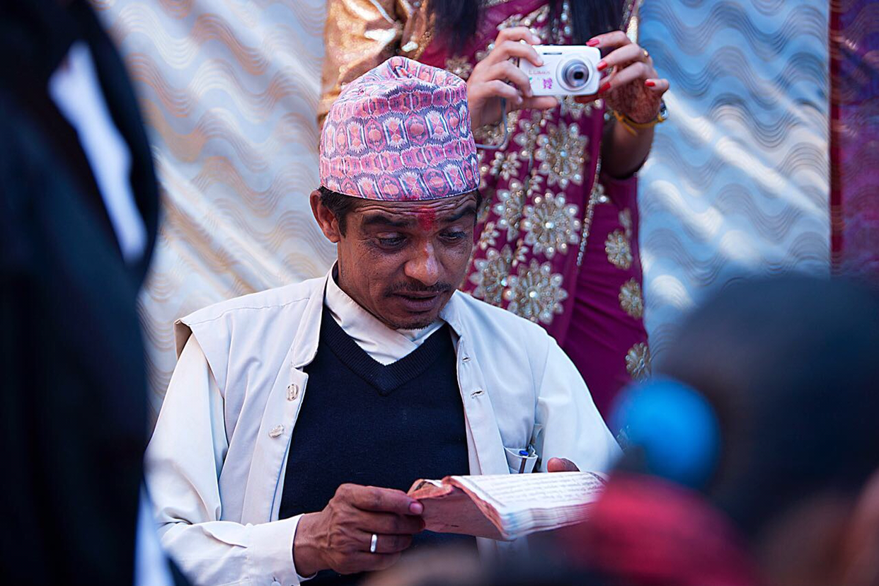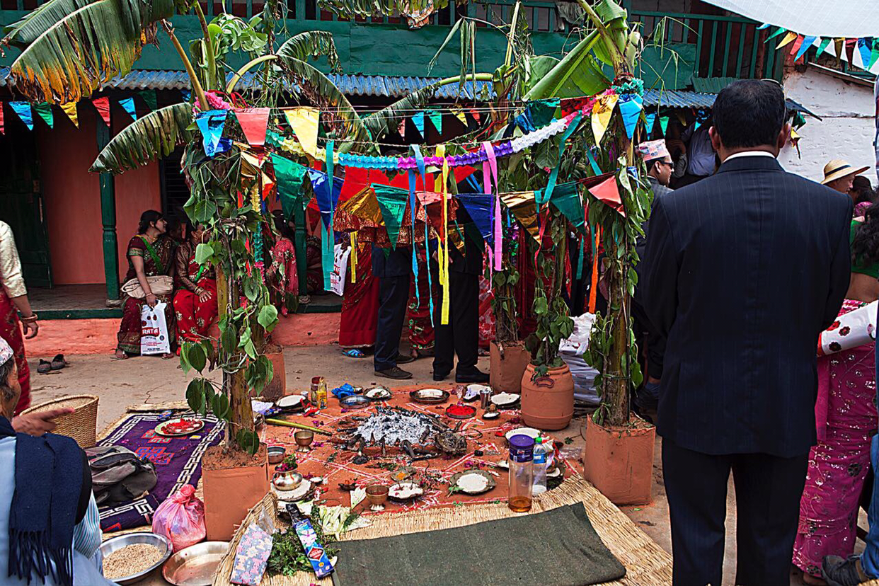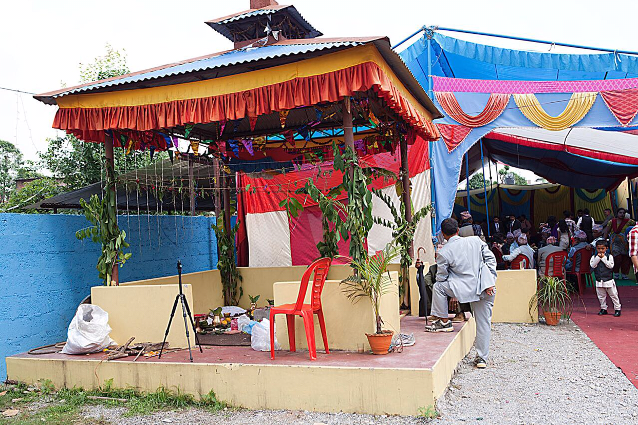 2부 의식은 바깥 정자에서 시작한다. 주례사, 신랑신부, 도우미 한사람 하고 신부 아버지가 삥 둘러 앉아서 의식이 끝날 때 까지 무엇인가를 태우고 뿌리고 바르고 한다. 2부는 이런 정자가 입구에 준비되어 있는걸로 보아 여기가 네팔 전통 결혼식장인것 같다.