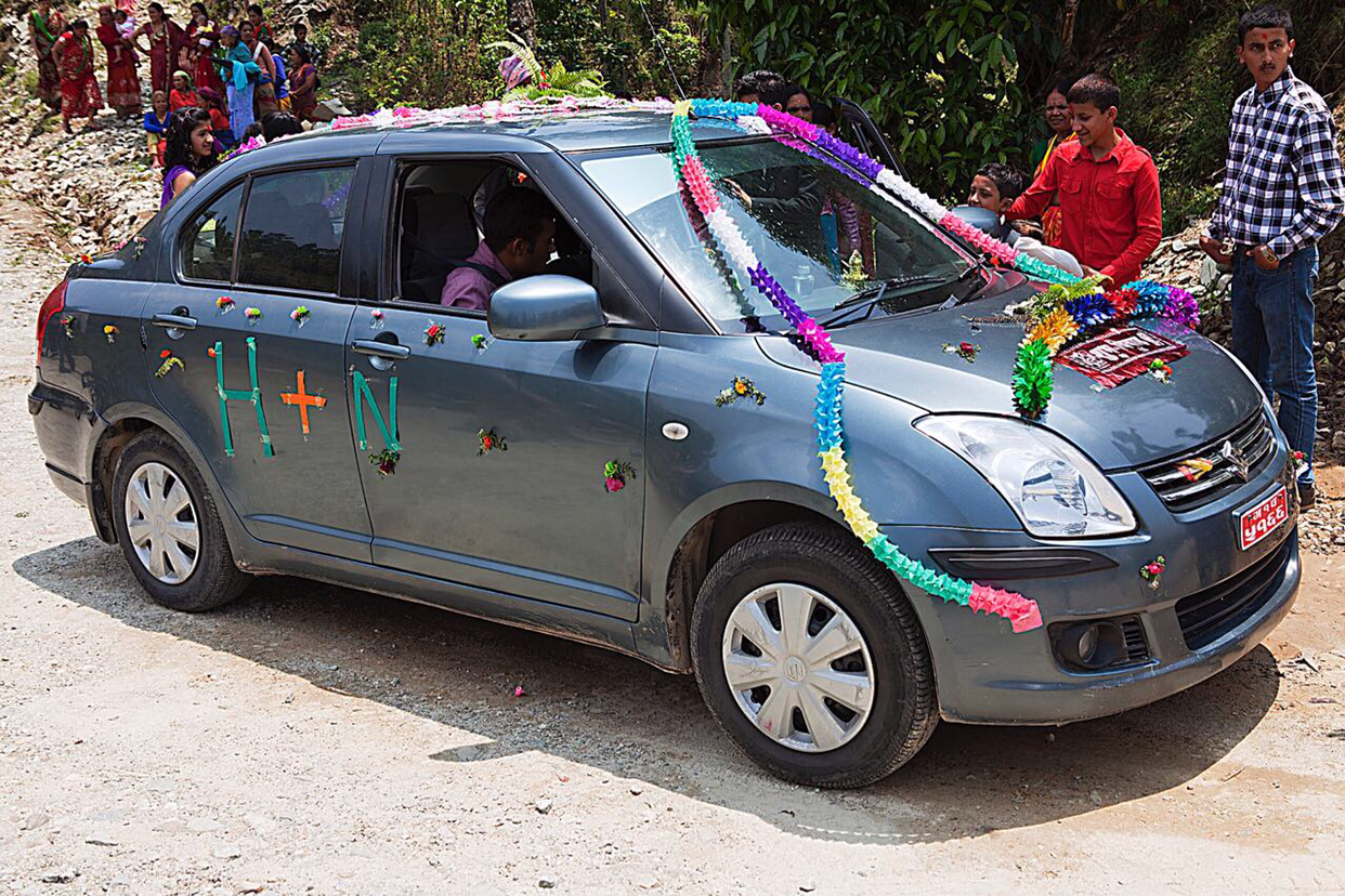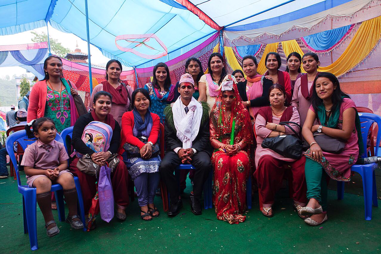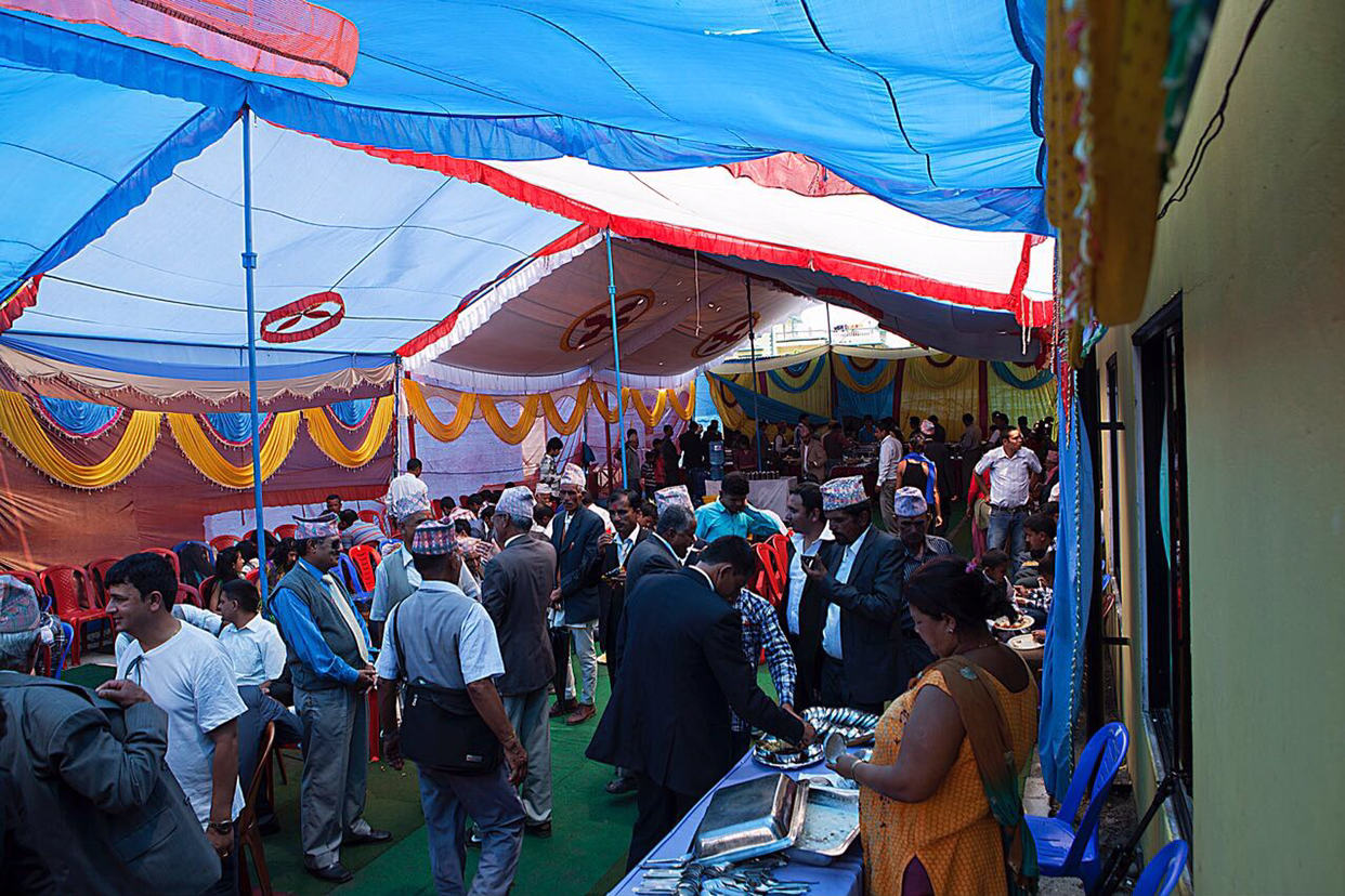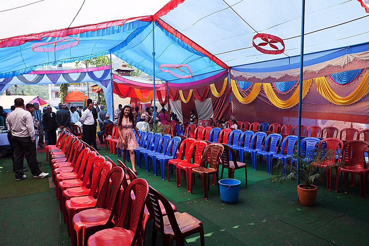 버스로 얼마 달리지 않아 신부가 사는 포카라에 도착해보니 집이 아니고 연회장 비슷한 곳에 의자와 음식들이 준비되어 있었다. 들어 가는 입구에 예쁘게 장식된 현수막이 걸려 있는데 뭔지 물어보니 "축, 결혼, 어서오십시오.” 라는 말이란다.