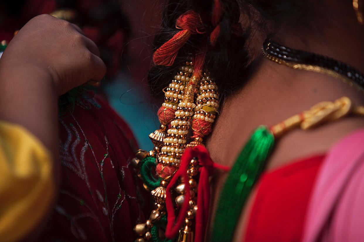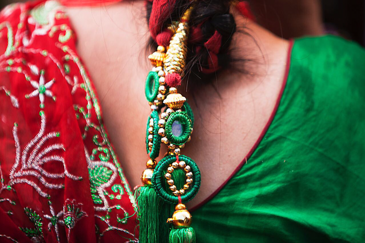네팔 여자들의 전통적인 머리 장신구
