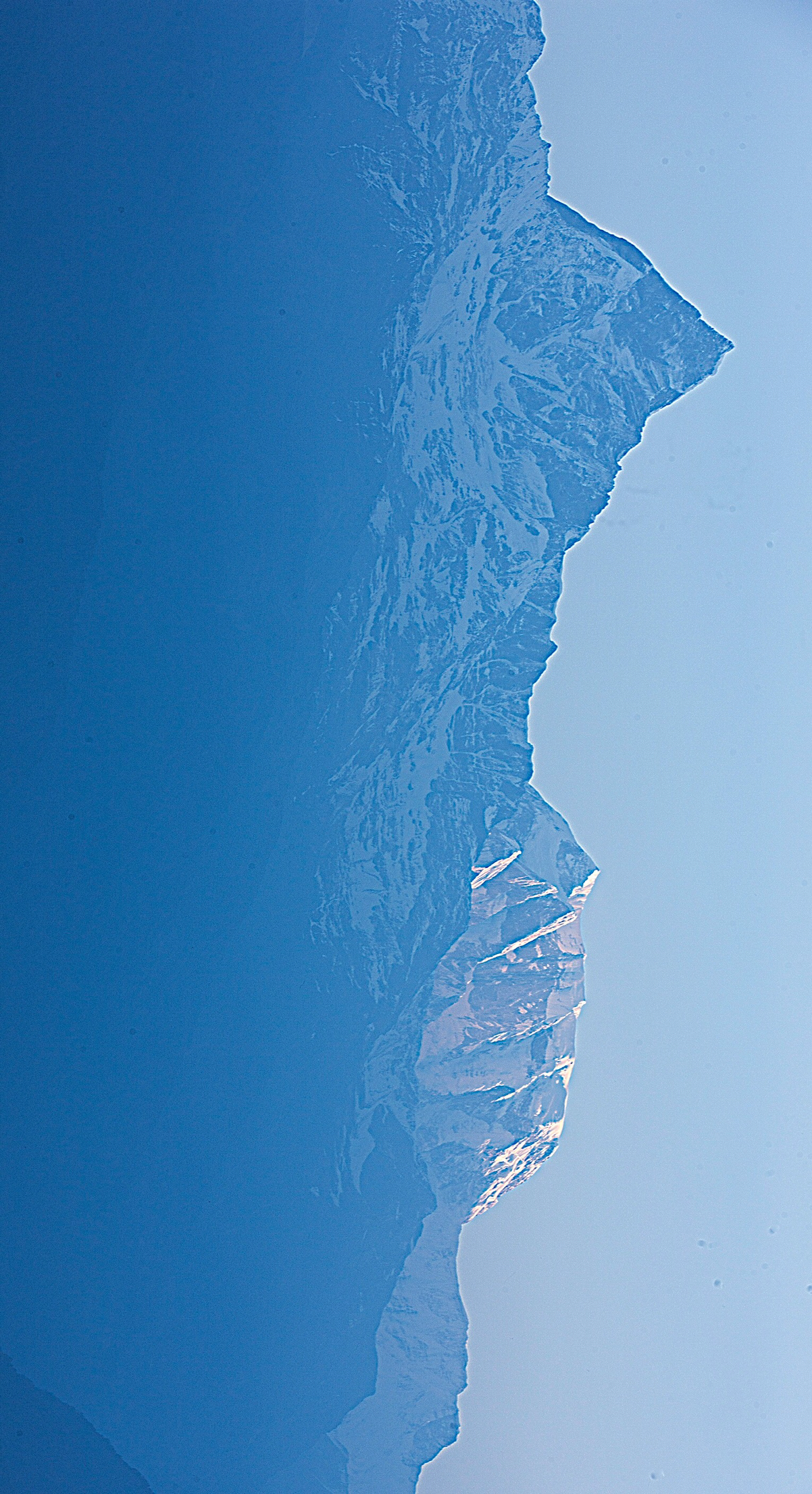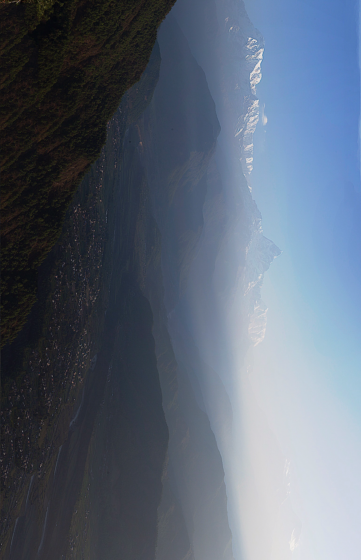안나푸르나 산맥들과 마을 전체를 한번에 잡아 보려고 세로 찍기를 4번으로 나누어서 MERGER 시켜 보았는데 오른쪽 부분에 밝은 빛이 들어와 디테일이 사라졌지만 일단 전체 파노라마를 볼 수 있도록 한번 시도해 본 것이다.