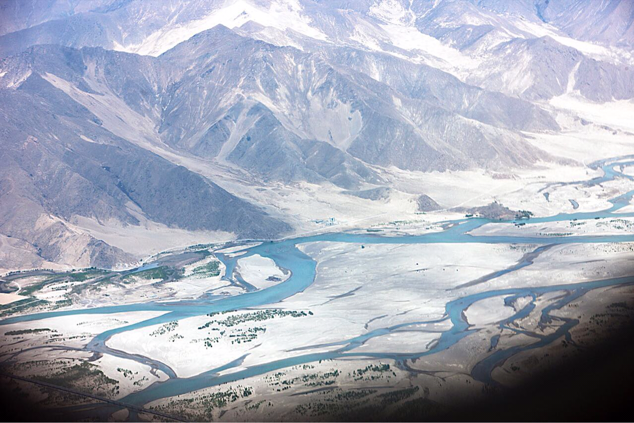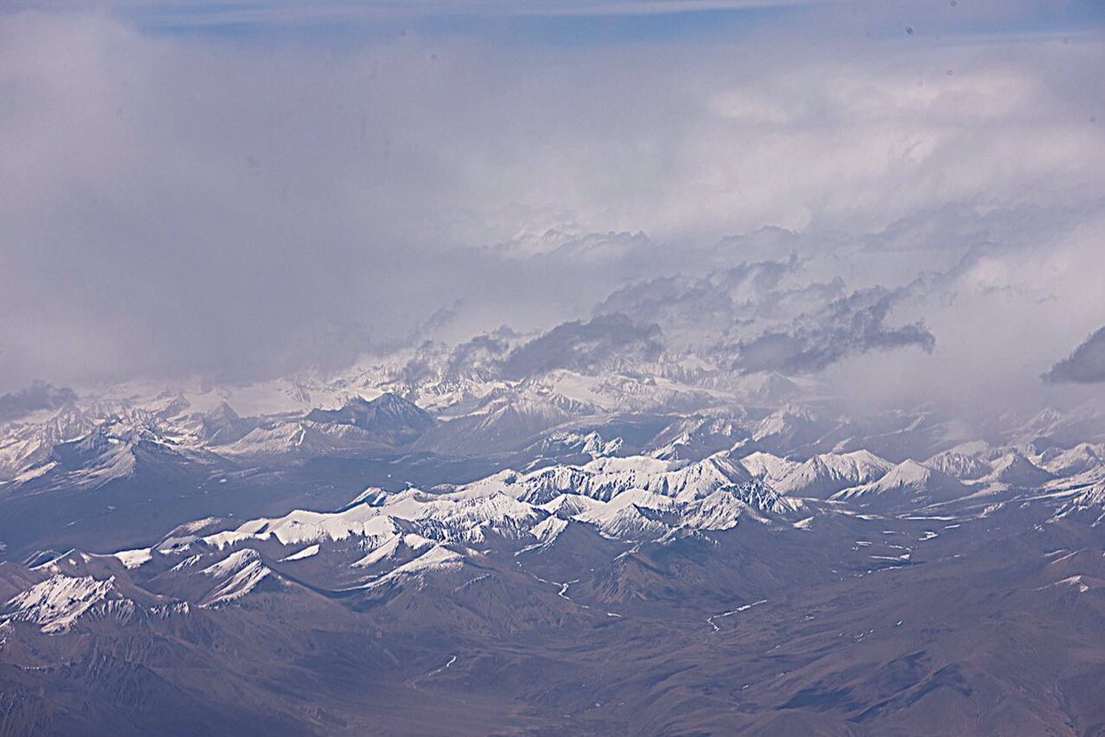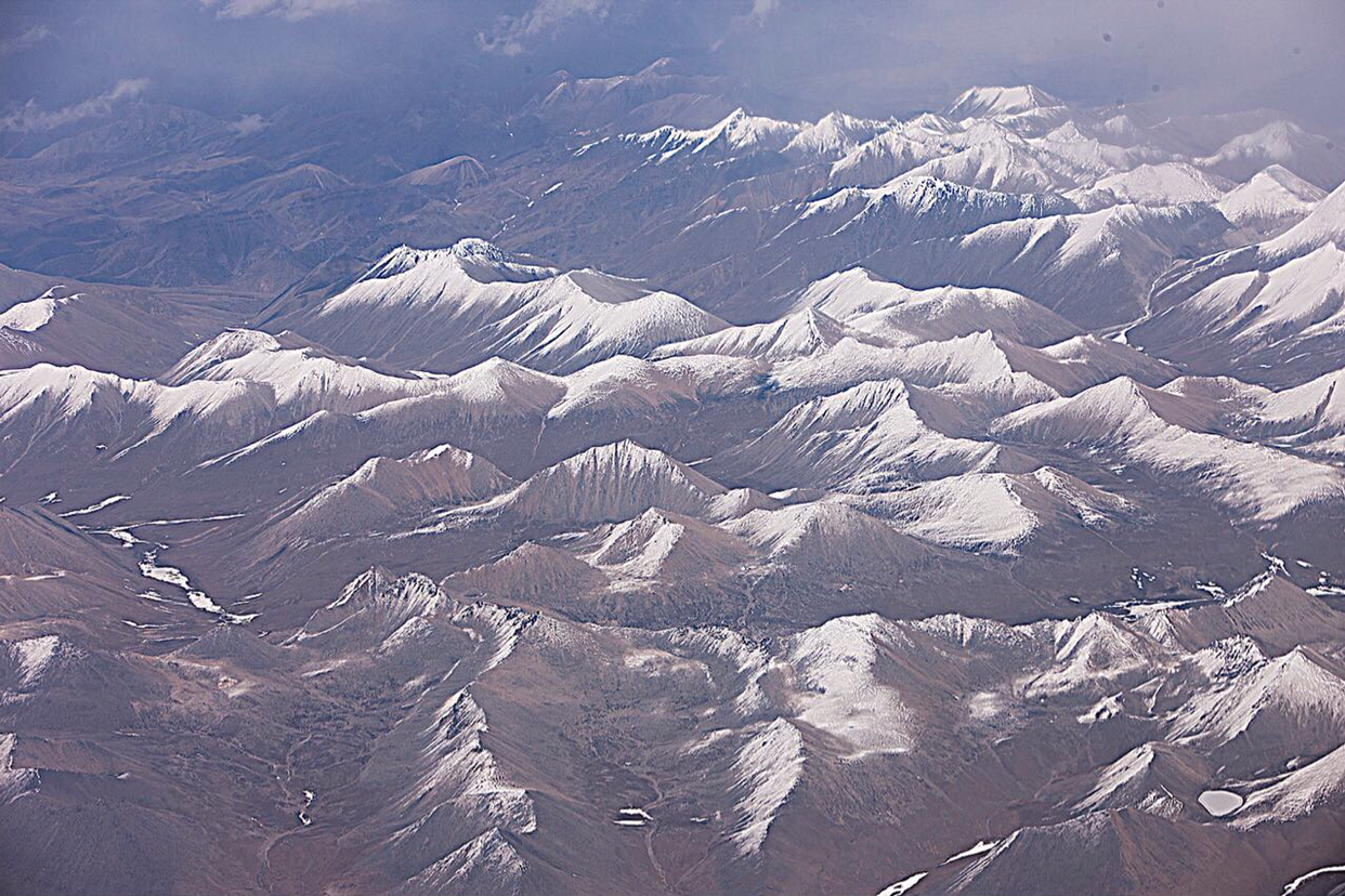 비행기가 그렇게 훌쩍 히말라야산맥을 넘었는지 갑자기 산색깔이 달라진다. 티벳땅으로 들어 온것 같다. 산색깔이 짙은 갈색으로 변하면서 산들의 높이도 많이 낮아진것 같다.