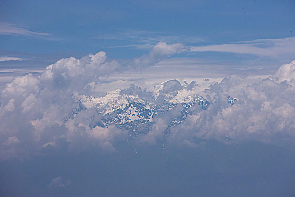 자리는 왼편 창가로 배정받아 앉았으니 구름만 가리지 않으면 반드시 히말라야 산맥이 보일거라 믿었다. 한 10분 비행하니 역시 산맥들이 구름 속에서 빼곳이 얼굴을 내민다. 분명히 히말라야인데 어디인지는 알 수가 없다. 같은 산이라도 보는 각도가 바뀌면 그 모습이 매번 다르게 보이기 때문이다. 저번 mountain flight 처럼 여승무원이 여기가 어디라고 설명해주면 좋으련만 그게 없으니 히말라야 어디쯤인지 전혀 감이 없다.