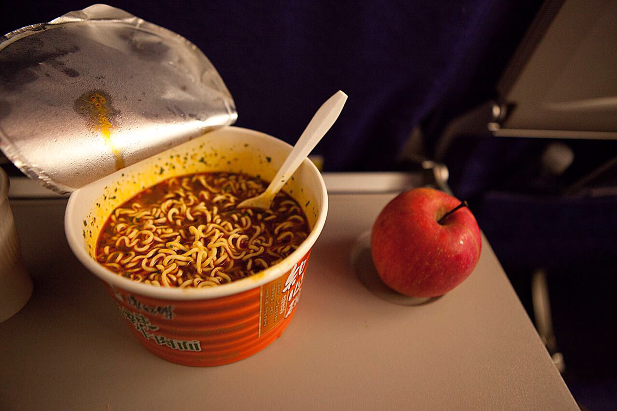 결국 시간이 없어 못 먹고 컵라면들고 시안행 비행기타서 뱅기 안에서 서로 말이 잘 통하는(?) 승무원 아가씨에게 더운물 좀 달랬더니 불쌍하게 보였던지 더운 물에다 사과 한알까지 얹어 갖다 주었다. 중국 여행책에서 보니까 중국라면중 우리 입맛에 맞는 라면은 "우육면"이라 해서 그걸 한번 먹어보았더니 진짜 입맛에 맞았다. 이렇게 저녁을 라면 한컵과 사과 한 알로 허기진 배를 채우면서 중국의 고도 씨안(서안) 센양 국제공항에 저녁 10시를 훌쩍 넘겨서야 도착했다.-JH-