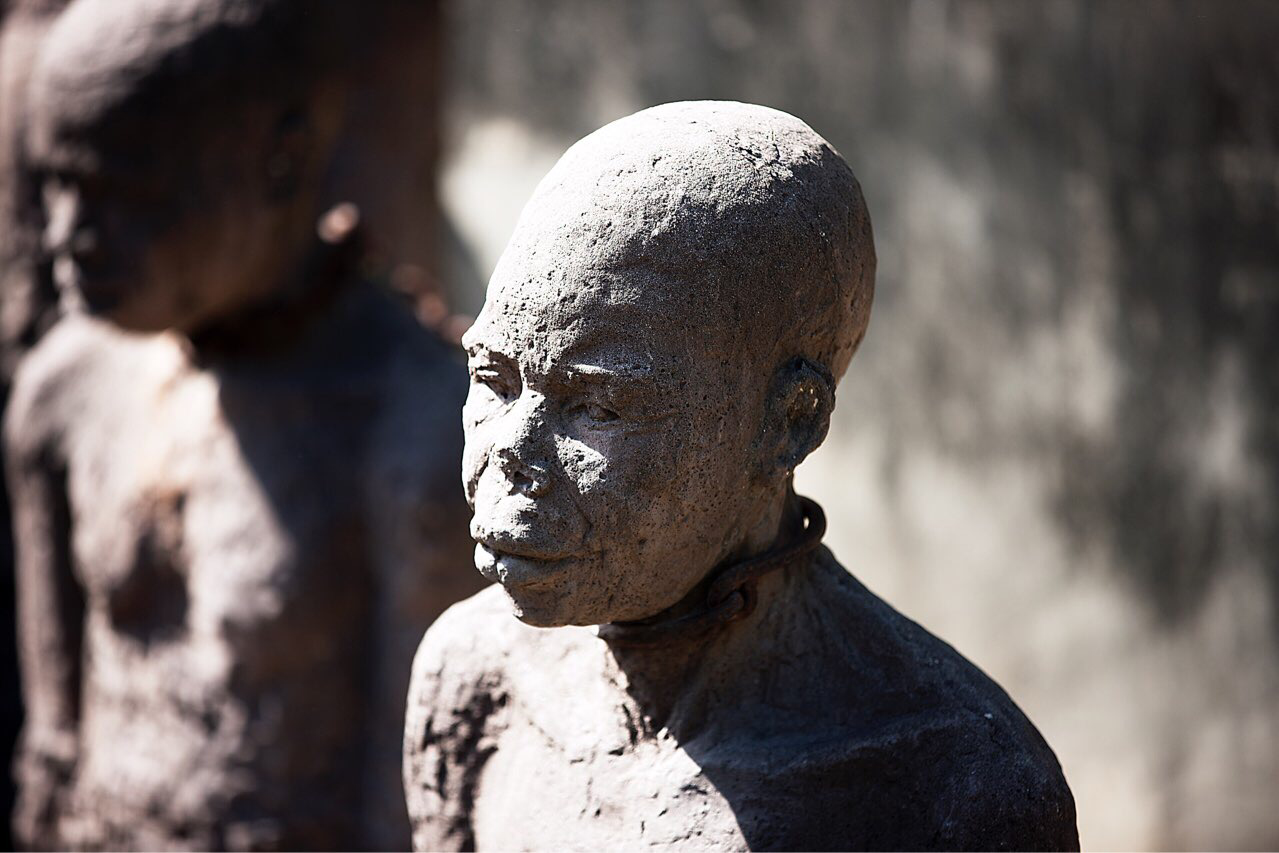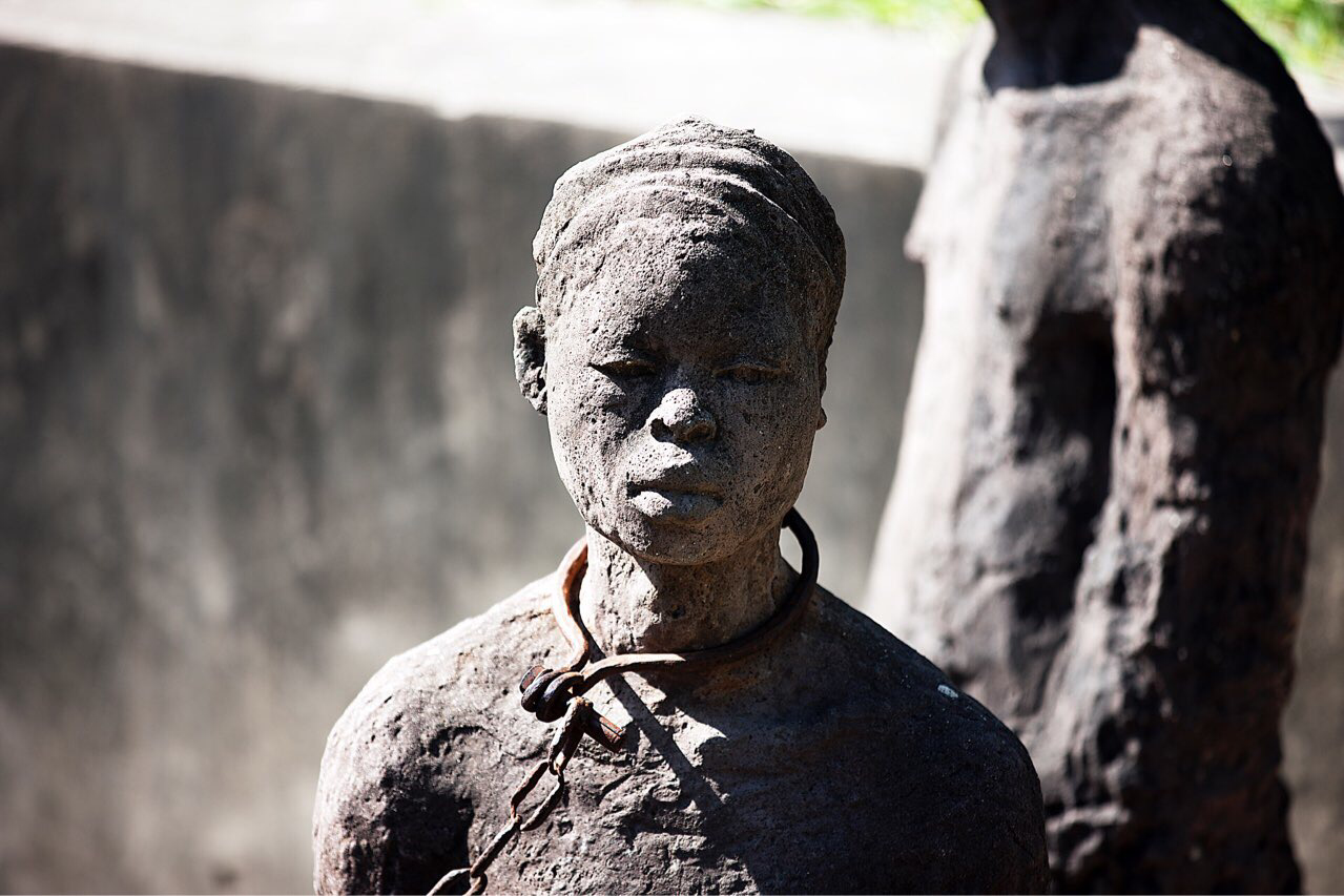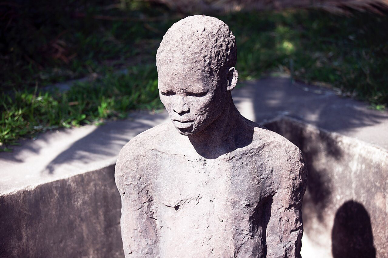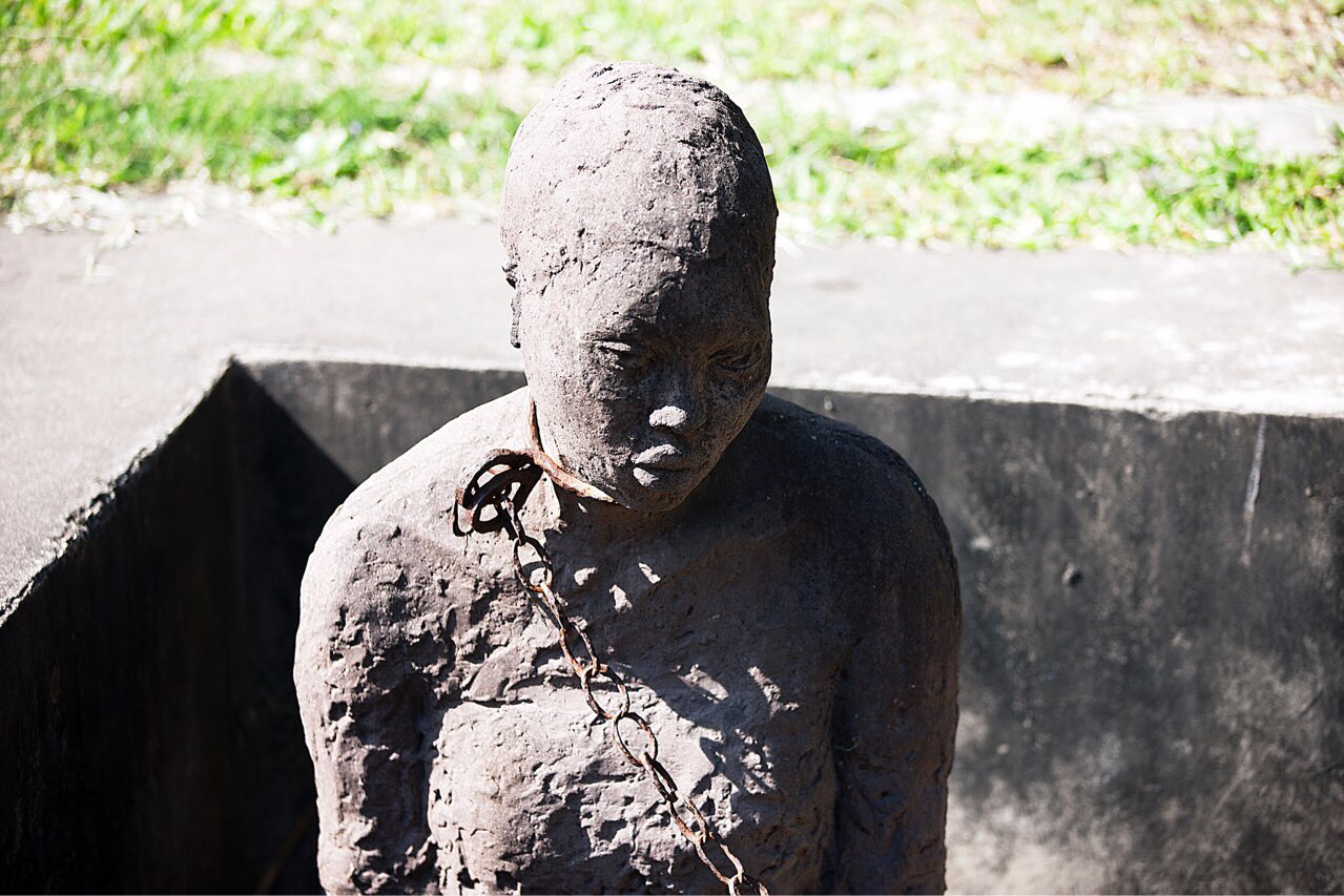 1873년 영국 정부에 의해서 노예 매매가 금지될 때까지 노예무역의 마지막 집배 장소가 여기였다고 한다. 잔지바르가 인도양에 접해 있기 때문에 잡혀온 노예들은 여기서 선별되어 중동, 인도 및 아시아로 보내졌다고 한다. 옛 노예 매매 시장터는 지금은 영국 복음 교회가 웅장하게 들어서 있어 그 때의 흔적을 찾기는 힘들지만 두 군데는 아직도 당시의 상황을 조금이라도 느낄 수 있다. 지금 복음교회는 그 뒤에 새로 신축한 것이고 옛날 복음교회는 다 허물어져 가는 모습으로 지금도 남아있어 관광객들에게 보여 주고 있다.