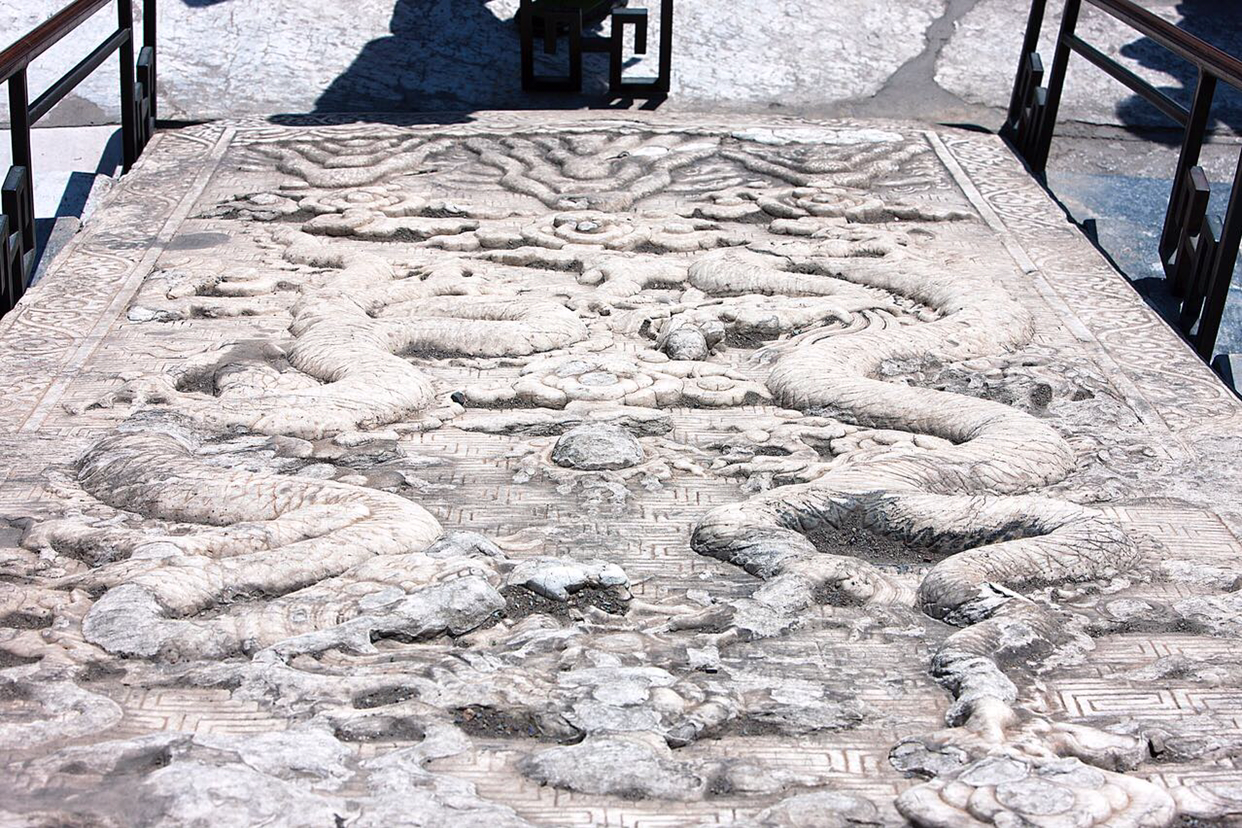 올라가는 계단 중앙에는 거대한 대리석에다 용, 봉황을 조각한 돌을 묻어 놓았는데 용봉석(龍鳳石)이라 한다. 황제의 위엄을 상징하는 것 같다.