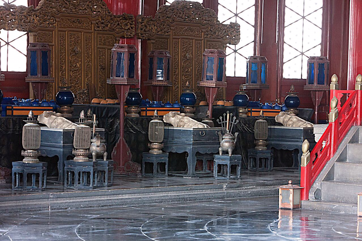 기년전 안을 둘러보면 중앙에 제단이 있고 좌우로 삥 돌아가면서 제기와 제물들이 놓여 있다. 눈길을 끄는건 제기에 담긴 제물인데 우리가 아는 돼지가 아니고 양이다.