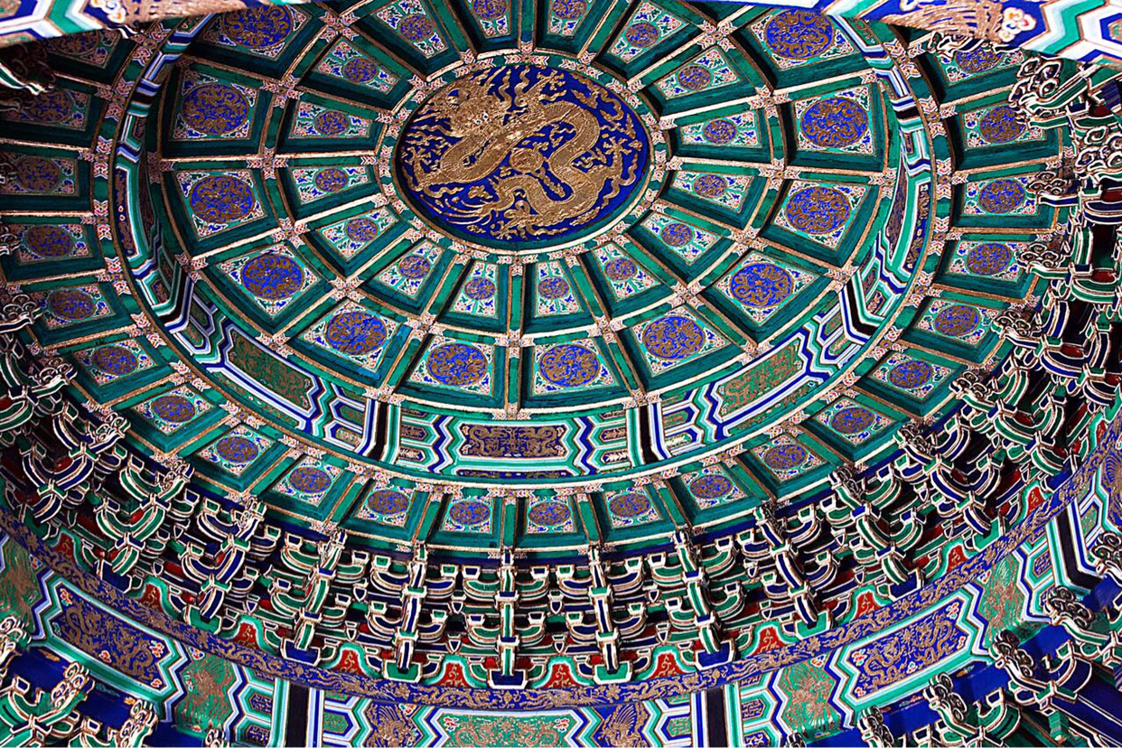 천단공원에서 제일 화려한 건물이 황궁우다. 황궁우 천정 및 내부 양식으로 천정 중앙에 금색으로 용을 장식하고 좌우로 돌아가면서 대칭무늬로 눈이 부시게 화려하게 단청색을 입혔다.