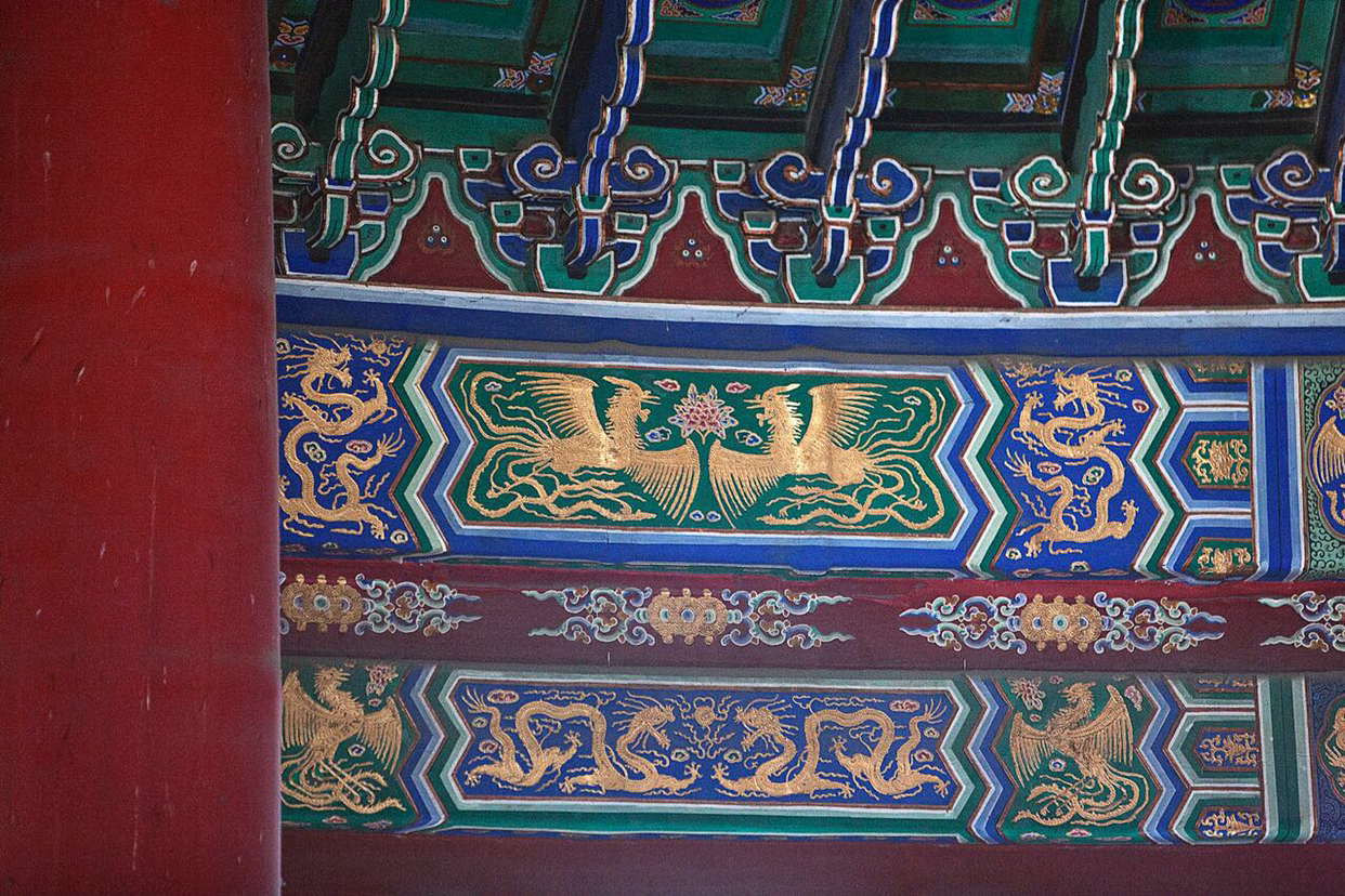 기년전 안과 밖에 새겨진 단청에는 어김없이 용과 봉황이 등장한다. 황제와 황후의 권위를 상징하는 동물로 기년전 현판에도 용과 봉황으로 가득하다.