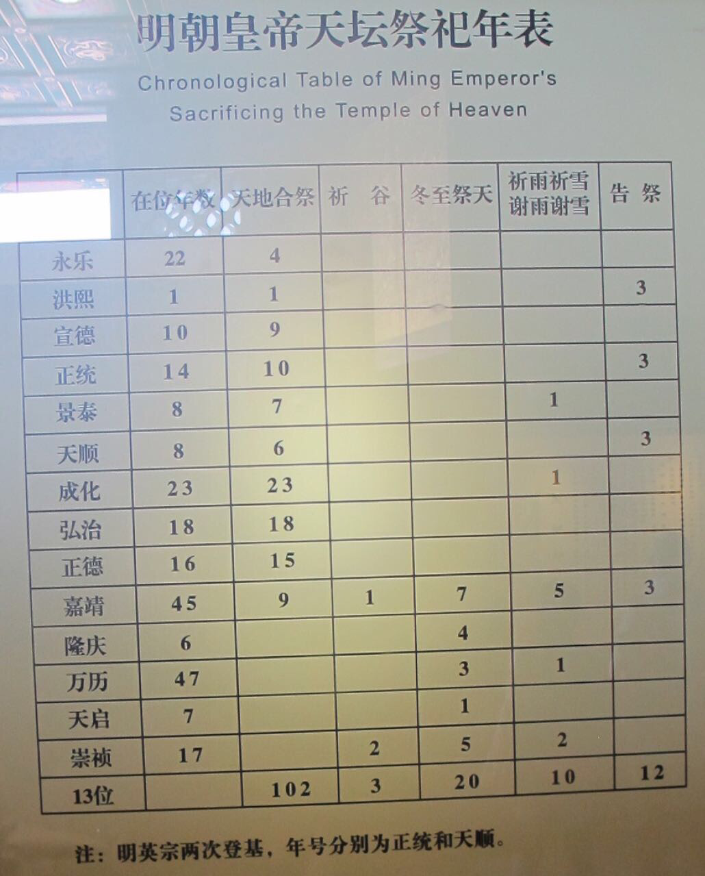 기록에 의하면 주나라시대부터 하늘에 제사지내기 시작하여 한나라이후부터 모든 황제의 기본 의무가 되었다는데 사료 전시실에 들어 가면 재미있는 기록이 있다. 명, 청 황제별로 누가 무슨 제사 몇번 올렸는지 정확하게 보여준다.