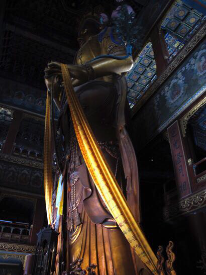 대웅전격인 법륜전 뒤에는 만복각이 자리잡고 있는데 이 사찰내에서 제일 큰 건물이다. 이유는 이 안에 모셔진 28 미터의 목각 미륵불이 있는데 나무 하나로 조각해서 만든 불상으로 당시 티벳 라마 7세가 만들어 건륭제에게 희사한 것이라 한다. 너무 크고 조명이 없는 관계로 한폭에 담기가 힘든다. 똑딱이로 겨우 한 폭에 담았는데 28미터 불상을 올려 쳐다 보기에도 힘들다.