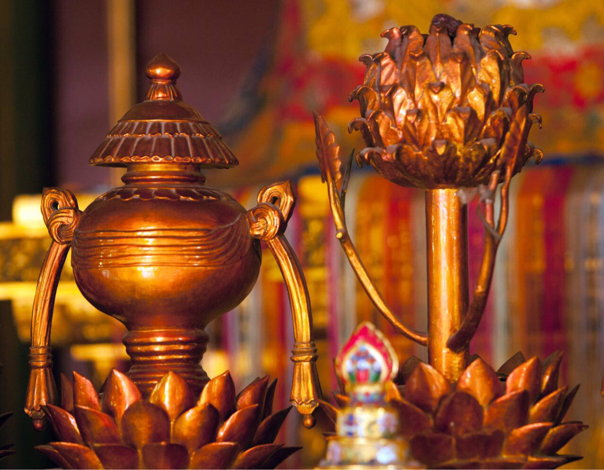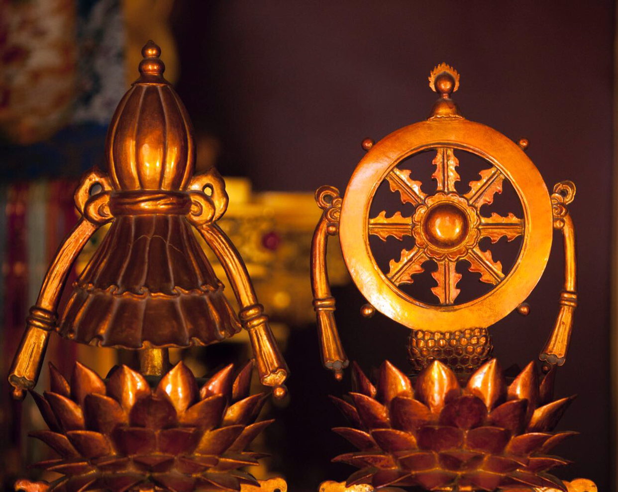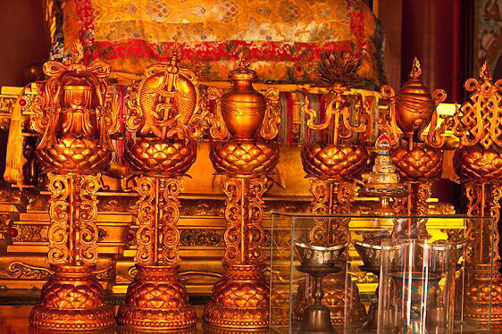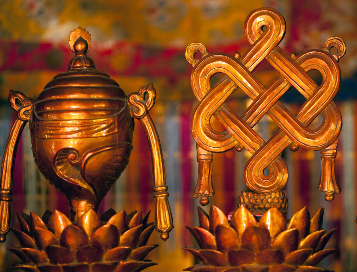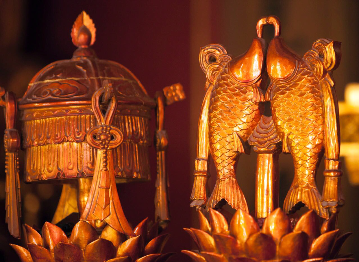 불전에 놓인 여러형상의 물건으로 불구(佛具)라고 하는데 하나 하나가 연꽃속에 놓여있다. 불구는 사찰의 일상의식에 쓰이는 의식용구와 법당을 장엄하게 장식하는 장엄용구로 나뉜다. 의식용구로는 조석예불때 치는 법고, 범종(梵鐘), 운판(雲版), 목어(木魚)로 이를 불교의 사물(四物)이라하고, 이것 외에 금고(金鼓), 향로, 다기, 촛대, 금강저(金剛杵), 불자(拂子) 등이 있으며 장엄용구로는 천개(天蓋), 화만, 번, 당, 화병 등을 들 수 있다. 그러나, 위 사진은 이러한 불구(佛具)를 나열한 것이 아니고 보통 티벳불교에서 말하는 "Eight Auspicious Symbols"이라고 해서 해탈한 부처님께 바치는 8가지 상징적인 불구(佛具)라고 할 수 있는 것들이다. 영어의 Auspicious는 경사로움을 지칭하는 뜻이다.