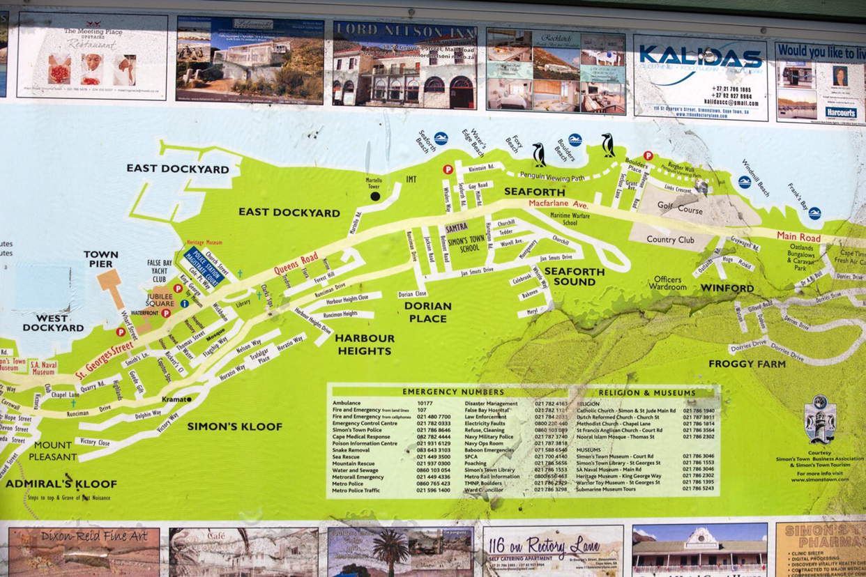 Fish Hoek에서 내려 버스를 타고 도착한 Simon옵의 마을로 아늑한 포구 마을이다. 관광안내도를 보니 여기가 겨울에 폭풍으로 사나운 희망봉 근처의 물살을 피하기 위하여 네덜란드 동인도회사가 1743년에 건설한 겨울 피난항으로 출발하였다가 그 뒤 영국 식민지하에서는 대영제국