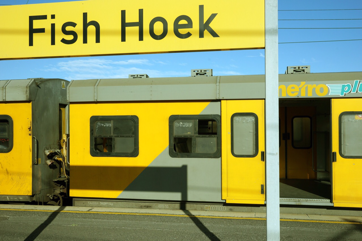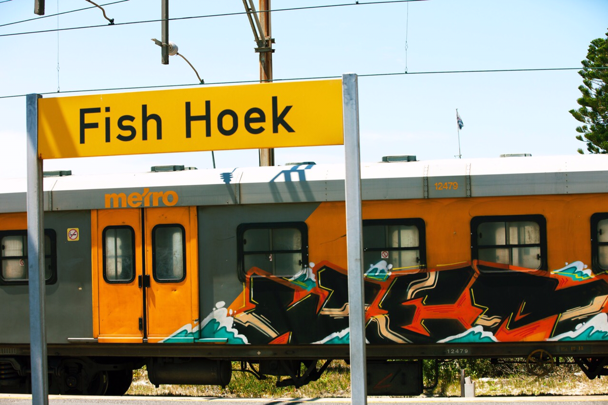 Fish Hoek 기차역. 강렬한 노란색 표지판과 기차의 도색이 인상적이었다. Fish Hoek의 비치가 유명하여 많은 현지인들이 주말에 비치에서 하루를 보내는 곳이라고 한다.