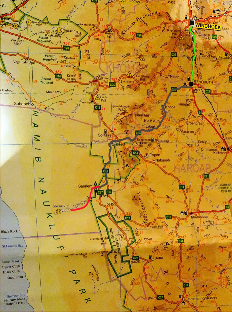 지도에서 녹색선이 숙소가 있는 수도 빈트후크에서 출발한 고속도로이고 회색줄이 바로 엉덩이에 심한 압박을 주는 산길 비포장도로이고 마지막 빨간선이 공원안 아스팔트 도로인데 약 61km 구간으로 저 방대한 사막 지역에서 말 그대로 "새발의 피"만큼만 보여주고 있다.