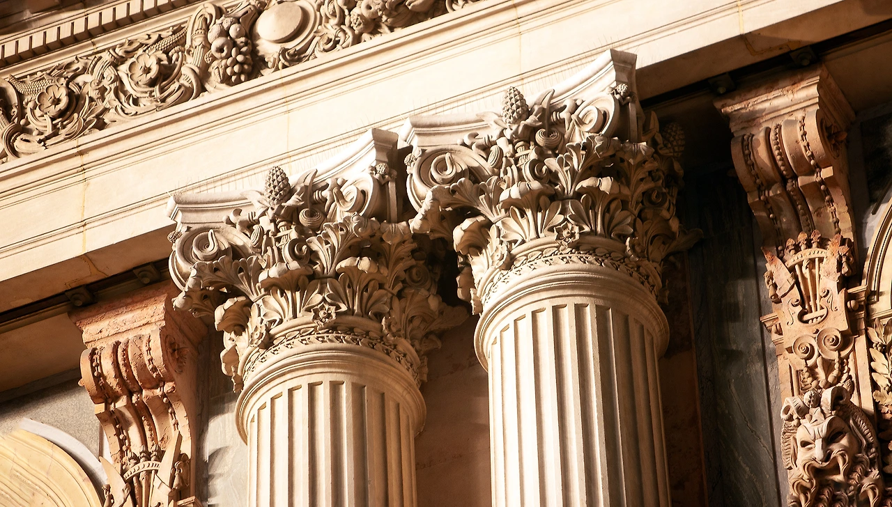 극장의 외관 모습이 독특하게 보이는 이유가 건축 재료가 돌, 대리석 그리고 청동이 적절하게 혼합되어 사용되었고, 건축 양식 스타일도 고전양식에서 바로크 양식까지 극장에 맞는 적절한 양식을 선택했기 때문이다.