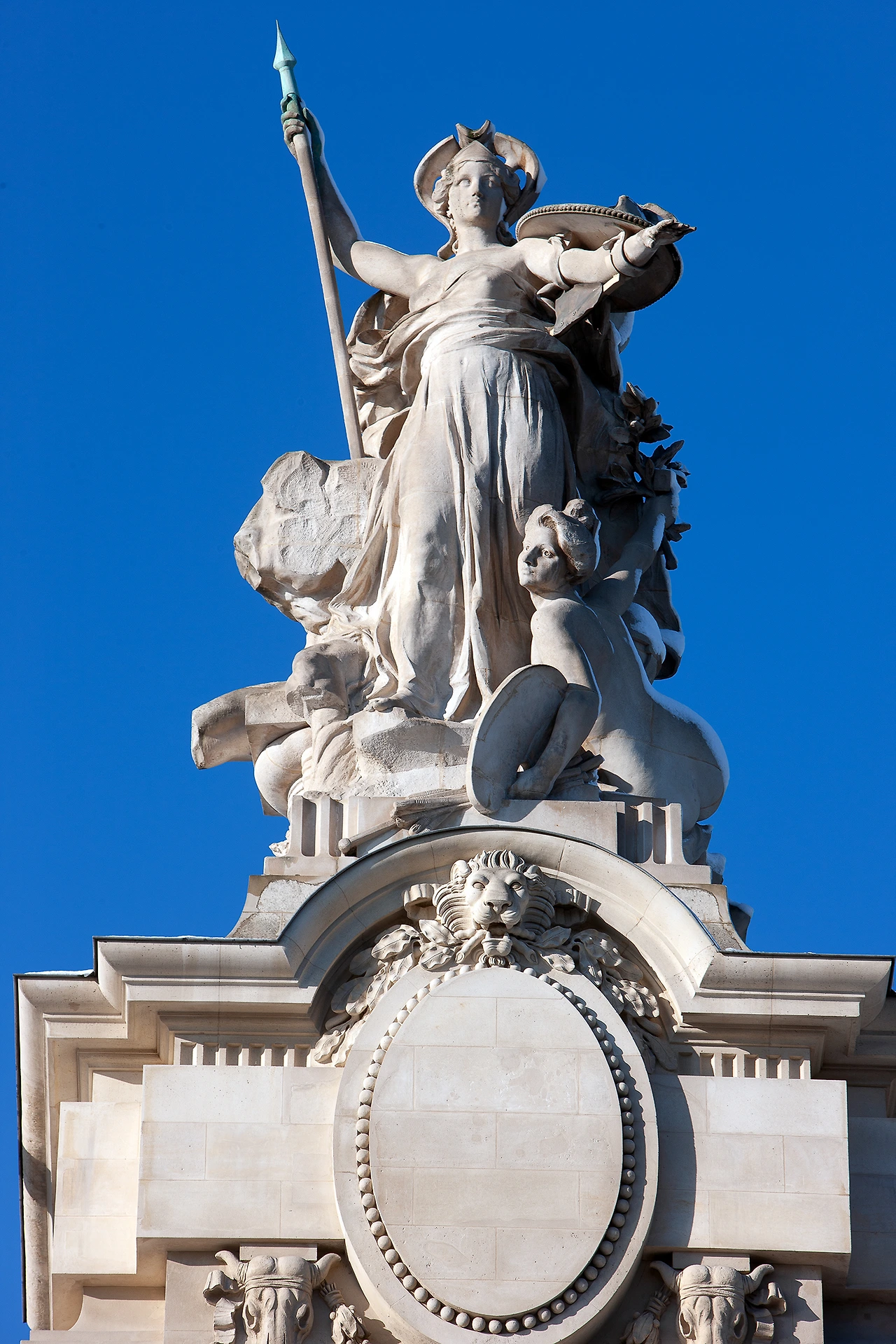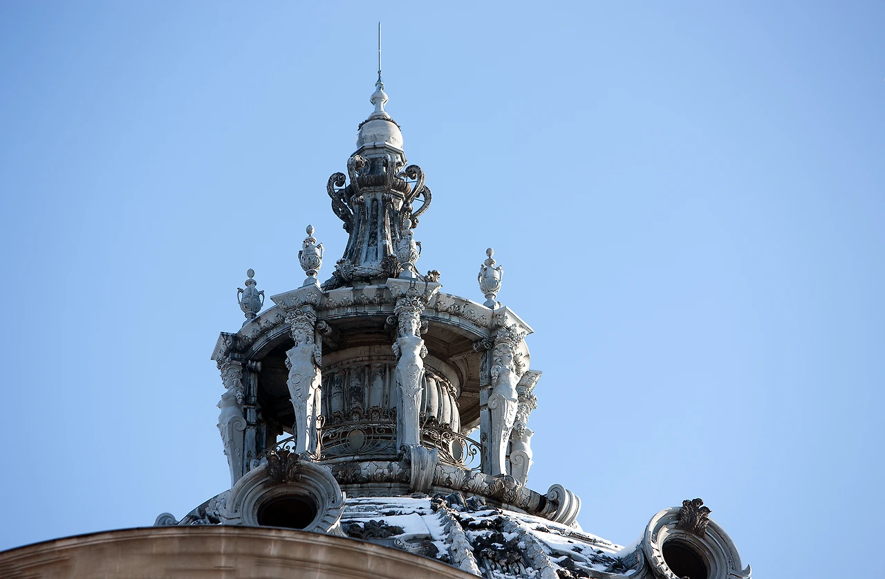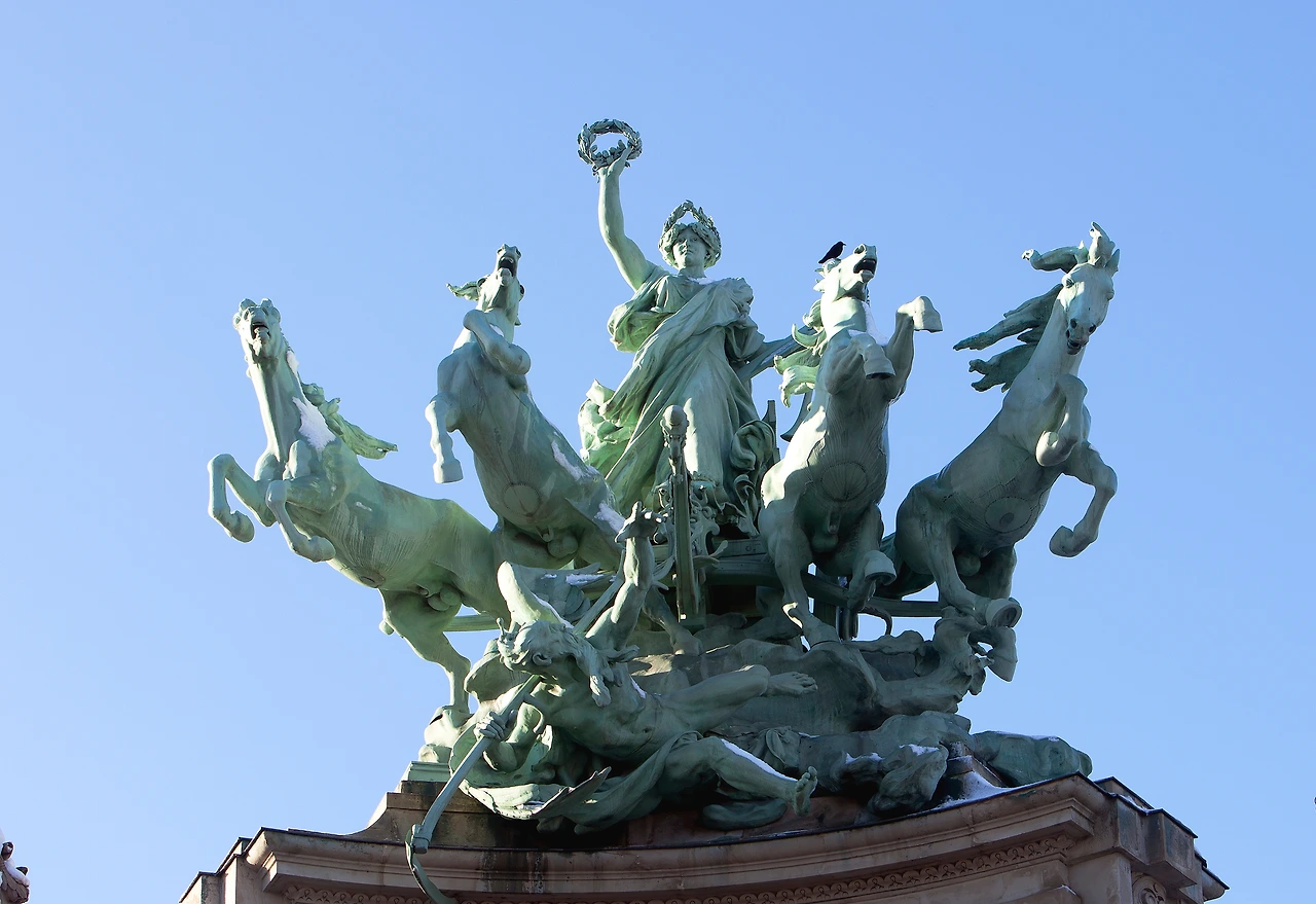말이 끄는 마차상 조각이 건물 4 귀퉁이를 장식하고 있다