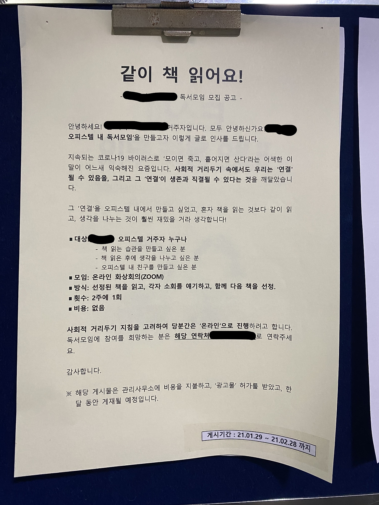 모집 공고문을 작성하고, 관리사무소에 연락했다. 게시판에 붙일 수 있는 건 광고전단뿐이라고 했다. 광고비를 내고 한 달 동안 공고문을 게재하기로 했다. 일주일이 지났다. 아무 반응이 없다. 당황스럽다. 아무 반응이 없을 거라고는 상상하지 못했는데.
