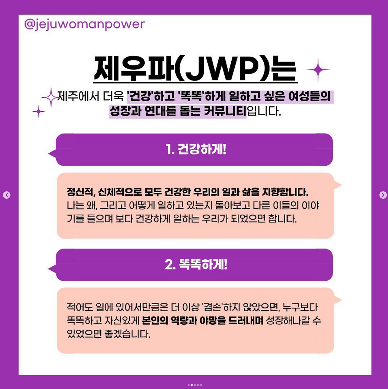 그녀는 제주에서 더욱 '건강'하고 '똑똑'하게 일하고 싶은 여성들의 성장과 연대를 돕는 커뮤니티인 제우파(JWP) 공동 대표를 맡고 있다. 운영진으로 참여하더니, 올해부터 공동 대표가 되었다고 한다. (서울에 올 생각이 있는 거 맞지?)