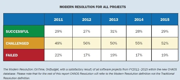 그럼 평균적으로 소프트웨어 개발 프로젝트의 성공률은 얼마일까요? 공식적으로 이에 대해 집계한 보고서가 있습니다. 바로 Standish group CHAOS report입니다. 2015년, 최신 집계에 따르면 아래와 같이 나옵니다. 결론적으로 2015년에는 약 29%만 성공했습니다. 대충 봐도 평균 30% 안쪽의 성공확률입니다. (여기서 성공했다는 뜻은 일정과 예산에 맞고 만족할만한 결과를 보여줬다는 뜻입니다.)
