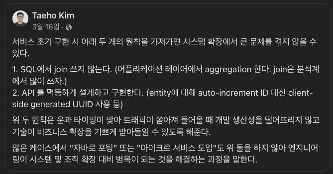 예전에는 Python만도 가볍다고 생각했는데 Node.js + Nest.js + TypeScript를 보니, 이것도 참 가볍다는 생각이 드네. 가볍다는게, 빨리 만들고 사업이 돌아가는 것에 따라 다시 엔지니어링을 하겠다는 가정이라. 문제는 은근히 이걸로도 제법 버틴다는게 충격과 공포. ㅎㅎ 개인적인 의견이지만, 점점 단순 CRUD에서 Clean architecture급의 고급 구조로 가야 하는 일은 정말 많이 있는지 의문이 든다. 워낙에 단순 CRUD자체도 충분히 잘 버티고 있고, 이를 버틸 수 없을만한 상황이 될만큼 사업모델 자체가 성숙하기 전에 꼬꾸라지는 프로젝트들을 많이 본다. 결국 이윤이 남는 사업모델이 돌아가는 서비스가 먼저다.